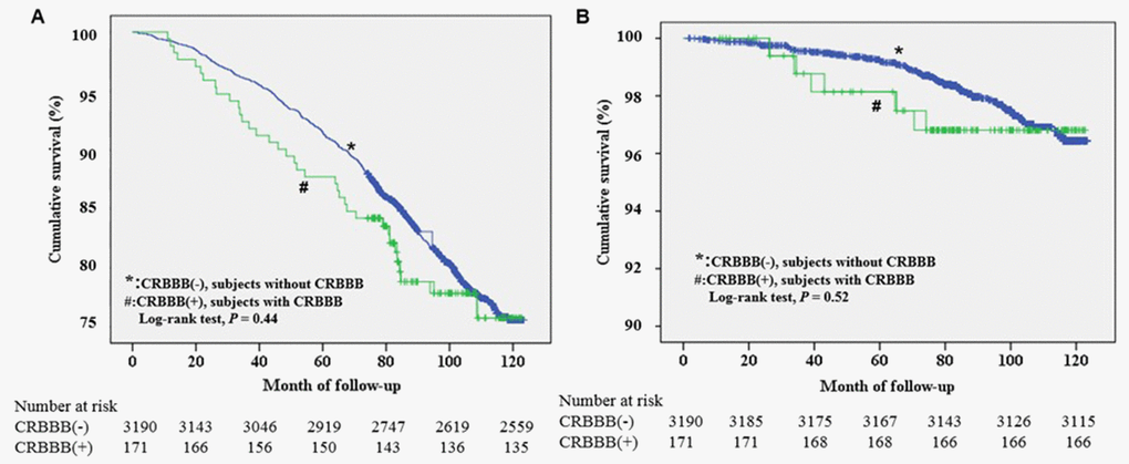 There were no significant differences in weight, body mass index, blood pressure, diabetes, dyslipidemia, previous events of stroke, atrial fibrillation, heart rate, and prognosis between those who had CRBBB and those who did not have CRBBB (Table 1). During an average follow-up of 92.6±23.6 months (7.7 years), neither all-cause mortality nor cardiovascular mortality were significantly different between the two groups (log-rank test, P=0.44, 0.52, respectively, Figure 4). After performing a Cox regression analysis controlling for potential confounders including stroke, hypertension, diabetes, dyslipidemia, and chronic kidney disease, CRBBB was still not significantly associated with all-cause mortality and cardiovascular mortality (P=0.48 and 0.56, respectively).