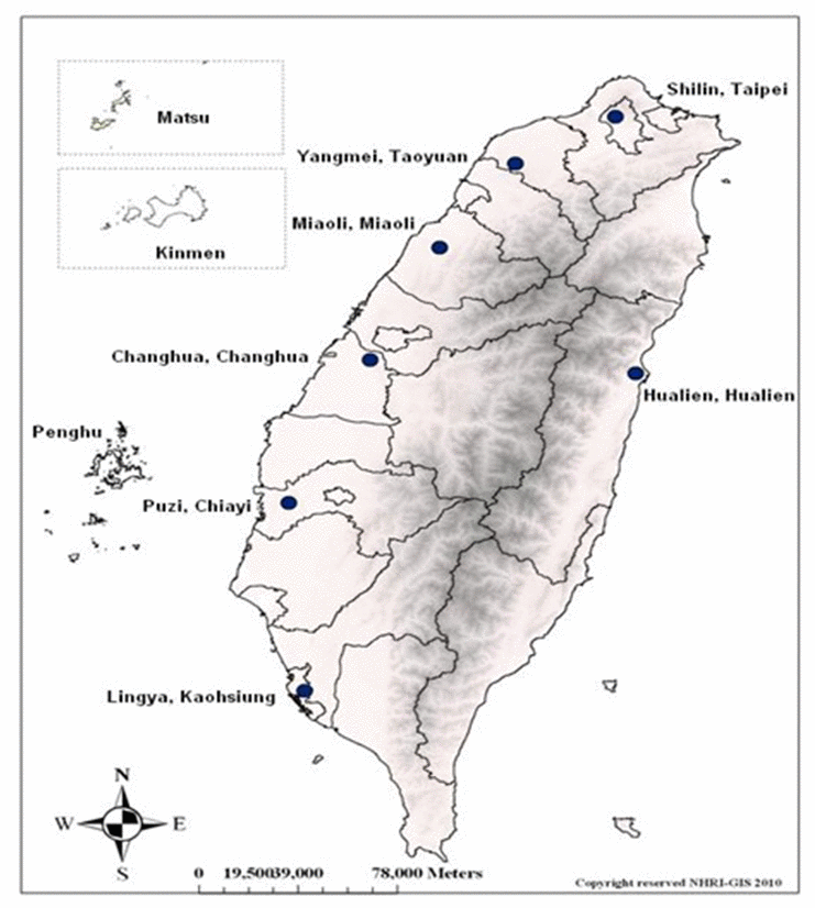 The HALST cohort has been described in our previous work [22]. In brief, the recruitment process was as follows: adults living in the townships located within 2 kilometers of the study hospital in 7 regions across Taiwan were stratified by age, gender, and education level, and respondents were selected from each stratum by the systematic random sampling method. These 7 locations (Figure 5) cover both urban and rural areas, as well as different ethnic groups speaking different dialects, reasonably representing diverse sociodemographic characteristics of the Taiwanese background population. The eligibility criterion was age 65 years or older, and exclusion criteria were a highly contagious infectious disease or severe illness including malignancy undergoing active treatment, inability to ambulate, and institutionalization or hospitalization. Subjects with severe hearing, speech, mental, or cognitive impairments were also excluded because of their inability to answer questions accurately.