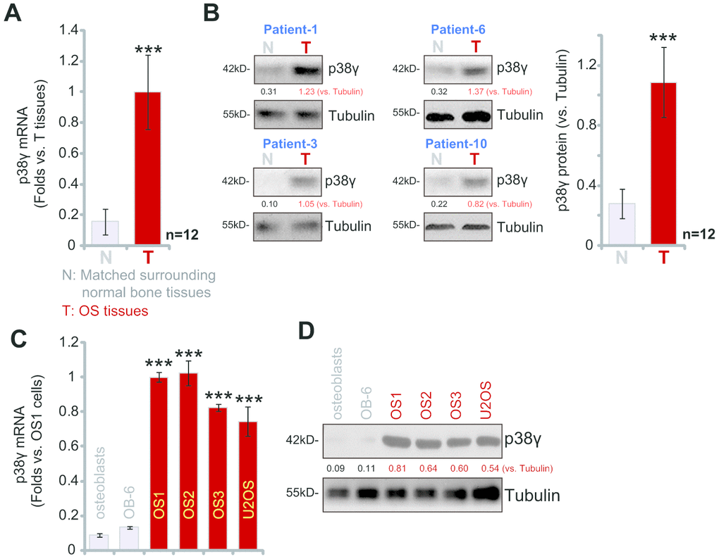 Examining p38γ expression, a total of twelve (n=12) different OS tissues derived from primary human OS patients were tested. qPCR analysis of mRNA expression revealed that p38γ mRNA levels in OS tumor tissues (“T”) were increased over six fold compared to matched surrounding normal bone tissue (“N”) (P<0.001, Figure 1A). Testing p38γ protein expression by Western blotting analysis confirmed a significant upregulation of p38γ protein in OS tumor tissues (Figure 1B, P<0.001 vs. “N” tissues). Similarly, p38γ mRNA (Figure 1C) and protein expression (Figure 1D) are also significantly higher in the U2OS OS cell line and primary human OS cells. The human OS cells were derived from three primary human OS patients, namely OS1, OS2 and OS3 (see Methods, Figure 1C, 1D). In contrast, p38γ mRNA and protein expression were relatively low in OB-6 human osteoblastic cells and primary human osteoblasts (Figure 1C, 1D). These results show that p38γ expression is elevated in human OS tissues and OS cells.