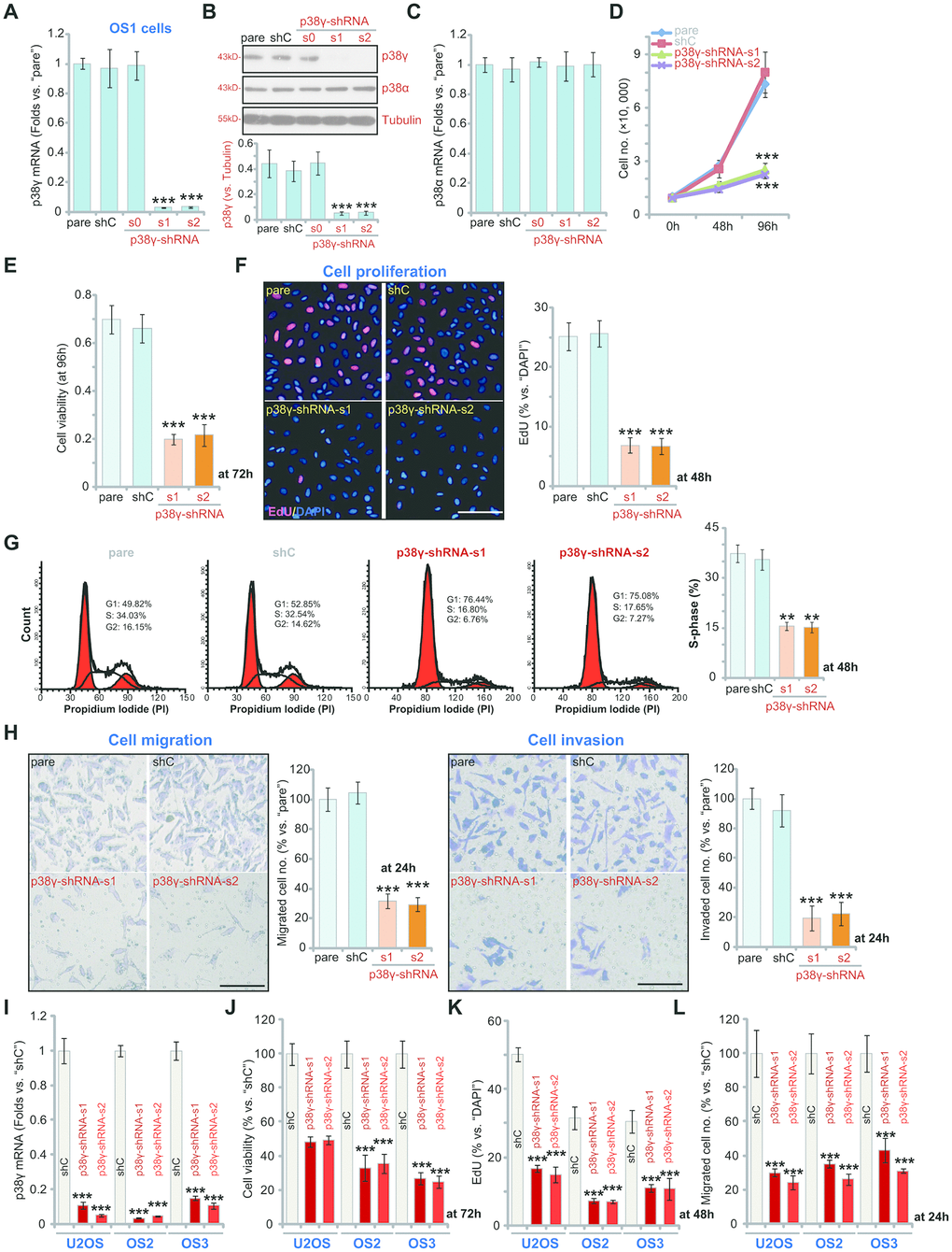 Further functional studies showed that silencing of p38γ potently inhibited OS1 cell in vitro migration and invasion, tested using Transwell (Figure 2H, the left panel) and Martial Transwell assays (Figure 2H, the right panel), respectively. Similar results were observed for the primary human OS cells-derived from patients, OS2 and OS3, as well as in the established U2OS cell line. In these cells each of the applied p38γ shRNAs (p38γ-shRNA-s1 and p38γ-shRNA-s2) robustly inhibited cell viability (CCK-8 OD at 72h, Figure 2J, P<0.001 vs. shC), proliferation (nuclear EdU ratio at 48h, Figure 2K, P<0.001 vs. shC) and migration (at 24h, Figure 2L, P<0.001 vs. shC). Collectively, these results show that in human OS cells p38γ silencing inhibited cell viability, growth, proliferation, migration and invasion.
