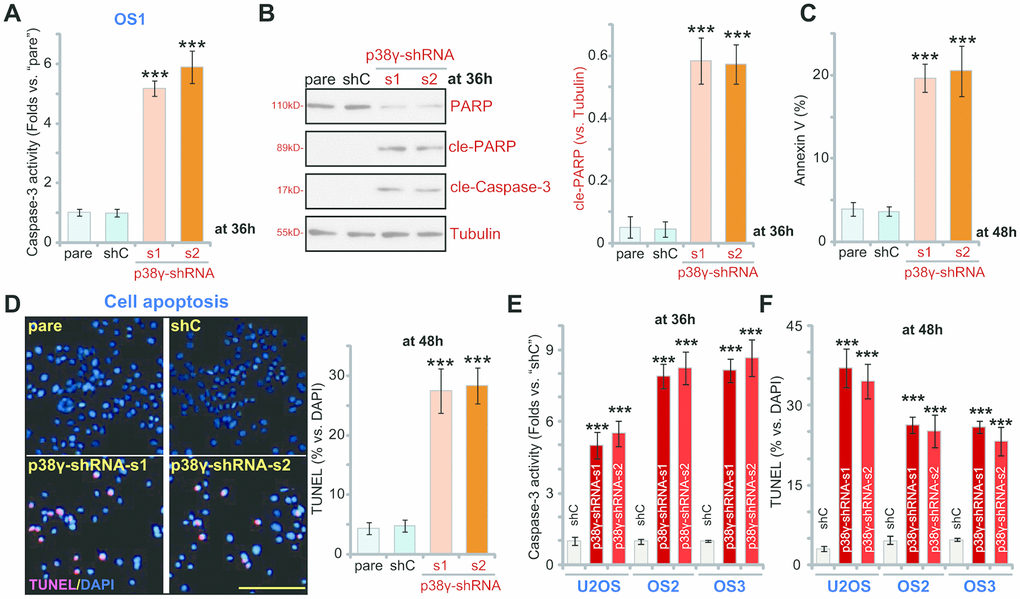 As inhibition of proliferation often results in apoptosis, we therefore examined apoptosis activation in p38γ-depleted OS cells. In p38γ-shRNA-s1/s2OS1 cells (see Figure 2) caspase-3 activity was significantly elevated (Figure 3A, P<0.001 vs. shC). Furthermore, increased levels of cleaved-caspase-3 and cleaved-PARP were also detected in p38γ-silenced OS1 cells (Figure 3B, P<0.001 vs. shC). Confirming apoptosis, p38γ knockdown significantly increased the ratio of Annexin V-positive OS1 cells (Figure 3C; P<0.001 vs. shC) and potently increased the ratio of TUNEL-positive nuclei (% vs. DAPI, Figure 3D, P<0.001 vs. shC). These results demonstrate that p38γ knockdown induces significant apoptosis activation in OS1 cells. The identical results were observed in primary OS2/ OS3 cells and in established U2OS cells, where shRNA-induced silencing of p38γ (by p38γ-shRNA-s1/p38γ-shRNA-s2, see Figure 2) increased caspase-3 activity (Figure 3E, P<0.001 vs. shC) and the ratio of TUNEL-positive nuclei (Figure 3F, P<0.001 vs. shC).