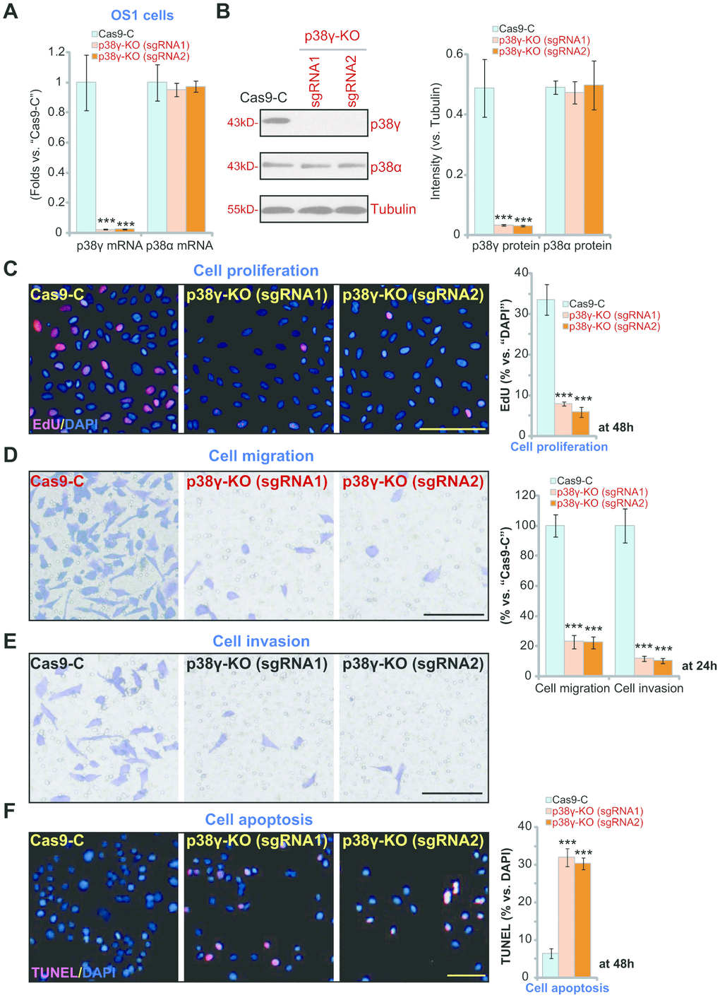 To determine the effect of completely depleting p38γ, the CRISPR/Cas9 strategy was utilized to knockout (KO) p38γ. Two lenti-CRISPR/Cas9-GFPp38γ KO constructs(“sgRNA1”and “sgRNA2”) were individually transduced into the OS1 primary human OS cells. Stable p38γ KO OS1 cells were established, where p38γ mRNA (Figure 4A) and protein (Figure 4B) expression was depleted (P<0.001 vs. cells with control construct, Cas9). The applied p38γ KO constructs failed to alter p38α expression (P>0.05 vs. Cas9 control cells, Figure 4A, 4B). Similar to shRNA results, CRISPR/Cas9-induced p38γ KO inhibited OS1 cell proliferation (Figure 3C, P<0.001 vs. Cas9 control cells), potently decreased in vitro cell migration and invasion (Figure 4D, 4E, P<0.001 vs. Cas9 control cells), and caused significant apoptosis activation (Figure 4F, P<0.001 vs. Cas9 control cells). Collectively, these results show that CRISPR/Cas9-induced p38γ KO inhibited OS1 cell proliferation, migration and invasion, while inducing apoptosis activation.