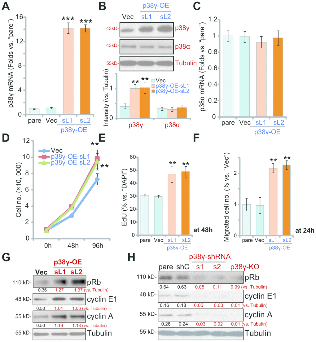Based on the above results we hypothesized that ectopic p38γ overexpression would promote OS cell progression in vitro. A pLenti6-puro-GFP-p38γ expression vector (from Dr. Zheng at Nantong University [10]) was used to establish the two stable cell lines, p38γ-OE-sL1 and p38γ-OE-sL2. qPCR results, in Figure 5A, confirmed that p38γ mRNA levels were increased over 12 folds in the p38γ-OE cells (P<0.001 vs. Vector control cells/“Vec”), resulting in significantly increased levels of p38γ protein expression(Figure 5B, P<0.01 vs. “Vec” cells). In contrast, p38α mRNA (Figure 5C) and protein (Figure 5B) levels were unchanged in p38γ-OE OS1 cells (P>0.05 vs. “Vec” cells). Results show that p38γ overexpression promoted OS1 cell growth (Figure 5D), augmented cell proliferation (nuclear EdU incorporation, Figure 5E, P<0.01 vs. “Vec” cells) and migration (Figure 5F, P<0.01 vs. “Vec” cells), further supporting a key function of p38γ in OS cell progression.