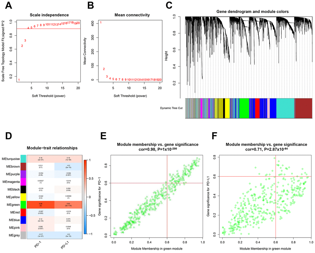 Using the limma R Bioconductor software package, a total of 3,868 differentially expressed genes (DEGs) were identified between BC and normal tissue, of which 2,688 genes upregulated and 1,180 genes downregulated in BC (Supplementary Figure 1A and 1B). Based on DEGs, a weighted gene coexpression network analysis (WGCNA) was performed to locate the gene modules in which gene expression patterns were similar. Here, we used a scale-free network distribution for the connectivity genes when the soft-threshold β value equals 4 (Figure 1A and 1B). Next, several gene modules were identified using average linkage hierarchical clustering (Figure 1C). Eleven major gene modules were identified (Figure 1D), of which the Megreen module genes positively correlated with both PD-1 (r = 0.98, p = 1 x 10-200) (Figure 1E) and PD-L1 (r = 0.71, p = 2.87 x 10-64) (Figure 1F). To reduce the scope of genes that correlated with PD-1 or PD-L1, two hub gene clusters were obtained from the Megreen module. The cluster correlated with PD-1 contained 131 genes (Supplementary Figure 2A, Supplementary Table 1), whereas the cluster correlated with PD-L1 had 37 genes (Supplementary Figure 2B, Supplementary Table 1). Using the limma packages and WGCNA, we obtained hub gene clusters that coexpressed with PD-1 or PD-L1 in BC.