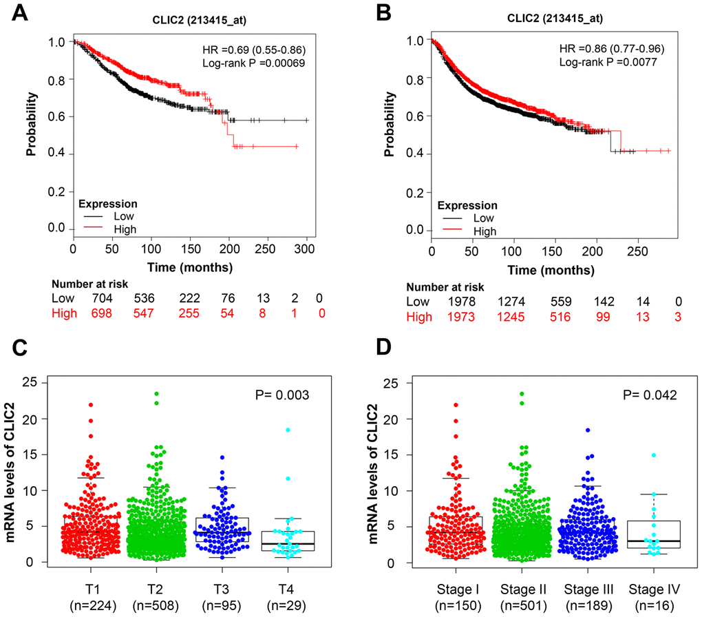 To determine whether CLIC2 or STX11 was linked to BC clinical performance, Kaplan-Meier survival analysis was used on various BC subtypes. The Kaplan-Meier survival curves showed that higher CLIC2 mRNA levels were associated with longer OS (HR = 0.69 [0.55-0.86], p = 0.00069) (Figure 4A) and RFS (HR = 0.86 [0.77-0.96], p = 0.0077) (Figure 4B) in BC, whereas STX11 failed to demonstrate a significant relationship with OS (HR = 0.86 [0.69-1.06], p = 0.16) and RFS (HR = 0.92 [0.83-1.03], p = 0.14) (Supplementary Figure 4A and 4B). PrognoScan platform results showed that 5 out of 31 tests have an association between CLIC2 expression and favorable prognosis in BC, whereas other tests showed no significant correlations (Table 2). When BC cases were divided by clinical signatures (tumor size or disease stages), CLIC2 mRNA level in small tumor or early-stage cancer tissue was significantly higher than that in larger tumor or advanced-stage cancer tissue, respectively (Figure 4C and 4D). Notably, no difference in STX11 levels was observed in BC, regardless of size or stage (Supplementary Figure 4C and 4D). CLIC2 was more closely linked to clinical performance in BC than STX11. Thus, we chose CLIC2 for further study.