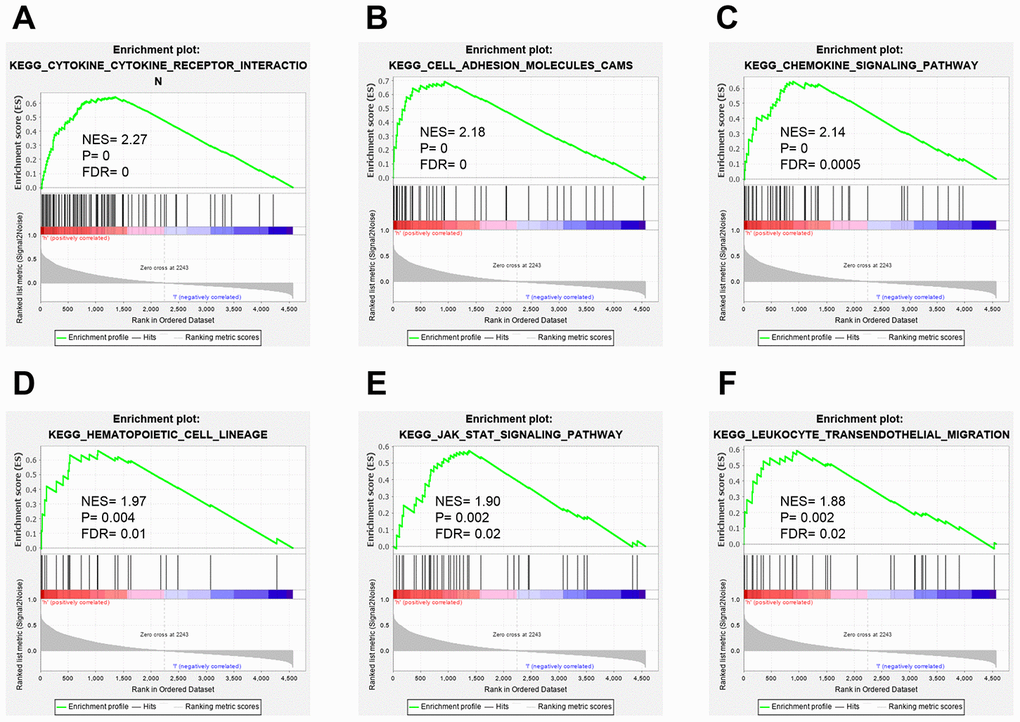 To our knowledge, no study has specifically investigated the role of CLIC2 on immunity function and whether immunity response is based on CLIC2 mRNA levels. Therefore, we next performed a gene set enrichment analysis (GSEA) to determine whether high expression of CLIC2 BC samples was more active in immunity. A total of 1,053 BC tissue samples were divided into two groups. We demonstrated that the CLIC2 highly expressed gene set was enriched in cytokine-cytokine receptor interaction, CAMs, chemokine signaling pathway, hematopoietic cell lineage, JAK/STAT signaling pathway, and leukocyte transendothelial migration (Figure 5A–5F). These results indicate that immunity of CLIC2 highly expressed BC is more active compared with CLIC2 lowly expressed BC.