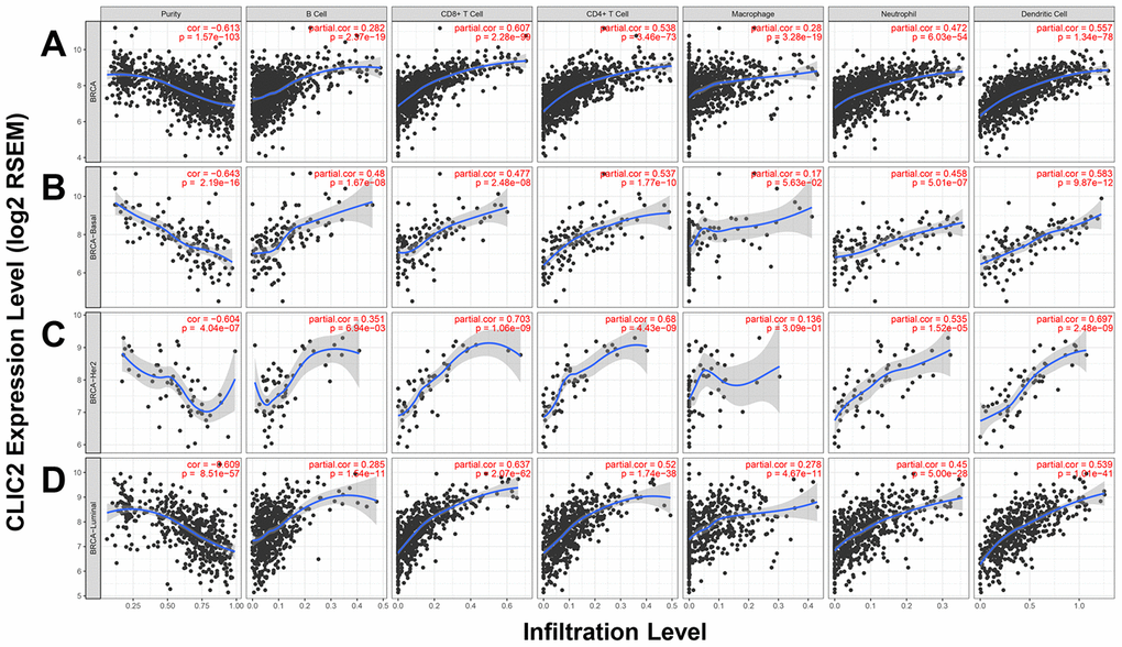 Because increased TILs improve prognosis in BC patients receiving immunotherapy, we used the Tumor Immune Estimation Resource (TIMER) web server to access the correlation between CLIC2 expression and six TIL types. Figure 6 shows that CLIC2 expression has a positive correlation with infiltrating levels of six immune cell types, including B cells, CD4+ T cells, CD8+ T cells, neutrophils, TAMs, and DCs, on total BC. Across all subtypes, CLIC2 expression positively correlated with all types of TIL enrichment in luminal cancer, whereas in basal-like cancer and HER-2 positive cancer, this relationship was also established between CLIC2 and all types of TIL enrichment, except for TAMs. This result, suggesting that CLIC2 highly expressed BC, was most likely accompanied by increasing TILs. We also examined correlation between CLIC2 expression and TILs on other tumors decreased in CLIC2 (Supplementary Figure 5). Similar results were found, particularly in lung squamous cell carcinoma (LUSC) (Supplementary Figure 6A), colon adenocarcinoma (COAD) (Supplementary Figure 6B), stomach adenocarcinoma (STAD) (Supplementary Figure 6C), and liver hepatocellular carcinoma (LIHC) (Supplementary Figure 6D). Our data showed that CLIC2 had a strong positive correlation with infiltrating levels of CD8+ T cells and DCs in these four cancer types.