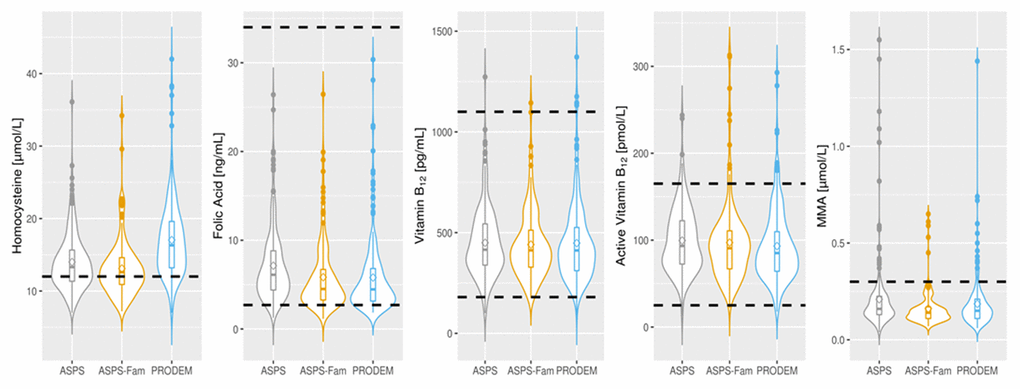 Demographics, frequency of risk factors and laboratory findings are displayed in Table 1 and Figure 1. All three cohorts included more females then males, and the controls are younger than the AD patients. HCY concentrations are mainly above the upper risk limit of 12 μmol/L in all three cohorts, but values in control subjects are lower than in AD patients. Folate levels are mainly located at the lower end of the reference range with higher levels in ASPS than in ASPS-Fam and PRODEM. Total B12, active B12 and MMA values fall well within the corresponding reference range.