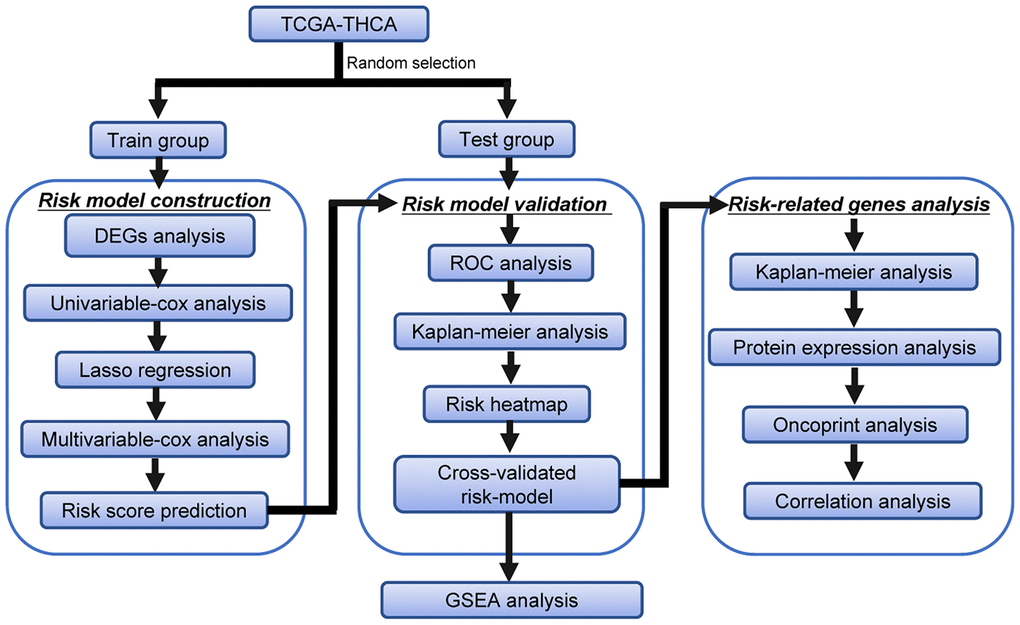 The detailed workflow of the risk model construction and downstream analysis is shown in Figure 1. We first found differentially expressed ARGs in THCA. Then, these DEARGs were identified in the training data set to build a specific risk model. The risk model was further verified and optimized in the testing data set. Time-dependent ROC analysis was used to test the predictive ability of the risk model. Finally, Kaplan-Meier analysis, protein expression analysis, OncoPrint analysis and correlation analysis were performed on the genes in the risk model.