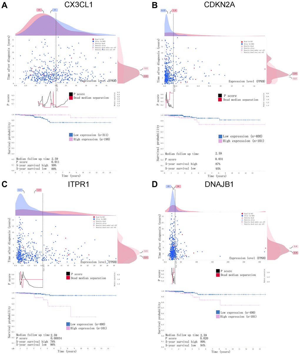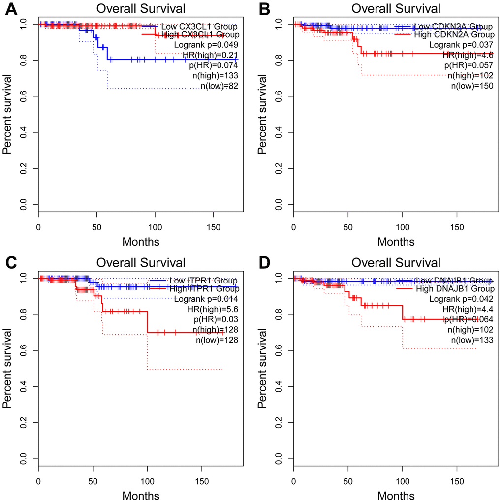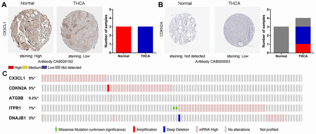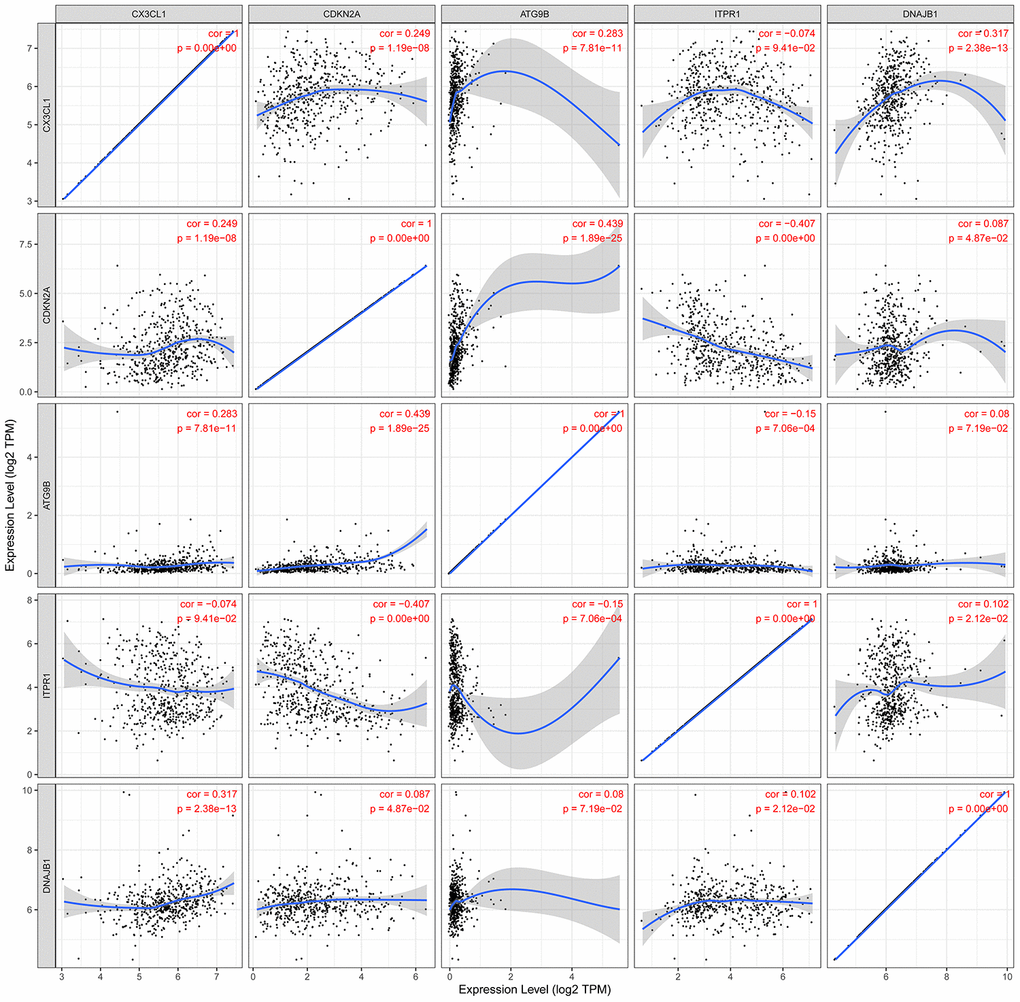 For the risk model, we identified a total of 5 genes and then further evaluated the prognostic value of the selected genes in other databases. The genes were analyzed by Kaplan-Meier in the GEPIA database. The results showed that CDKN2A, ITPR1 and DNAJB1 were negatively correlated with OS in THCA, while high expression of CX3CL1 indicated a good prognosis (Figure 9). In general, the results of the Kaplan-Meier analysis were consistent with the results of the univariate Cox analysis, which indicates that most of the genes are significant in the risk model and have strong predictive power. Next, we analyzed the protein expression pattern of the genes in the risk model through the HPA database (Figures 10 and 11A, 11B). The results showed that CX3CL1 protein was less expressed in normal thyroid tissue but moderately expressed in thyroid cancer tissue (Figure 11A). CDKN2A was not detected in normal tissues but was expressed at low levels in tumor tissues (Figure 11B). These results were consistent with most mRNA levels we observed previously. There were no data on ATG9B in the Human Protein Atlas database. Then, we used the cBioPortal database to examine the CNV and mRNA expression changes of these genes (Figure 11C). The results showed that CNVs were involved in the mRNA expression changes of these genes. It is worth noting that CDKN2A, ITPR1 and CX3CL1 showed the highest CNVs and mRNA expression changes in the entire analysis sample, which may indicate that CNVs are the main driving forces for the mRNA expression changes of these genes. The correlation analysis of the five selected genes in the TIMER database shows that most genes were closely related in mRNA expression (Figure 12). Because we found that high-risk and low- risk patients have significant prognostic differences in OS, we next used the GSEA method to explain the enriched features and pathways between high-risk and low-risk patients. In the GSEA enrichment results, we observed that signals such as “RESPONSE_TO_OXIDATIVE_STRESS”, “MTOR_SIGNALING_PATHWAY”, and “MAPK_SIGNALING_PATHWAY” were enriched in the high-risk group, while the low-risk group showed enrichment in “INFLAMMATORY_RESPONSE”, “DEFENSE_RESPONSE”, “REGULATION_OF_PEPTIDASE_ACTIVITY”, and “EPITHELIAL_CELL_DIFFERENTIATION” (Figure 13). Some studies have shown that these signals are related to the occurrence and development of thyroid cancer. In summary, the GSEA results suggest that autophagy-related signals are related to the development and progression of THCA.