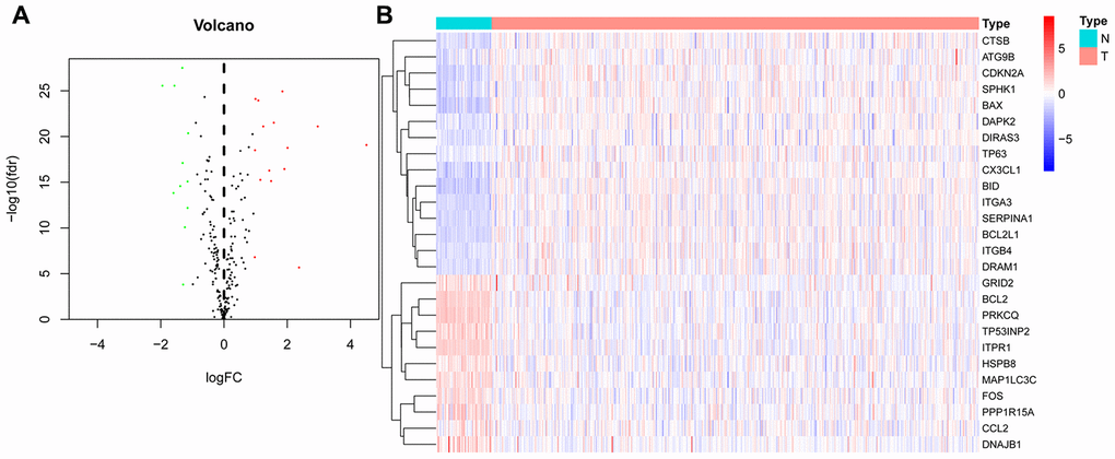 We downloaded the mRNA expression data and corresponding clinical information of 510 THCA tissue samples and 58 nontumor samples from the TCGA database (Table 1, Supplementary Table 1). After extracting the expression values of 232 ARGs, we obtained differentially expressed ARGs, and the expression patterns of the DEARGs in THCA and nontumor tissues were depicted in volcano and heat maps (Figure 2). In THCA, 26 differentially expressed genes were found, of which 11 genes were downregulated in tumor tissues and 15 genes were upregulated (Figure 3). Then, we performed functional enrichment analysis of the DEARGs, which is helpful for understanding the biological processes of these genes. Figure 4 and Supplementary Table 2 summarize the GO term and KEGG pathway enrichment of these genes. In THCA, we found that the most abundant GO items in the biological process category were neuron death, neuron apoptotic process and intrinsic apoptotic signaling pathway. The most enriched cellular components were the mitochondrial outer membrane, autophagosome and organelle outer membrane. In terms of molecular functions, the genes were mostly enriched in BH domain binding, death domain binding and protease binding (Figure 4A). In addition, in the KEGG pathway enrichment analysis of the differentially expressed ARGS, we found that these genes were significantly correlated with platinum drug resistance, endocrine resistance and EGFR tyrosine kinase inhibitor resistance (Figure 4B).