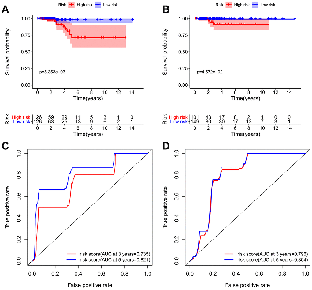 To explore the relationship between ARGs and prognosis, we established a risk model in patients with thyroid cancer. Initially, univariate Cox regression analysis was performed to obtain genes significantly related to prognosis, and then lasso regression and multivariate Cox regression were used to generate the final prognostic model (Figure 5, Table 2). After establishing the risk model, the patients were divided into a high-risk group and a low-risk group, and then Kaplan-Meier survival analysis was conducted on the training set and testing set. The results showed that patients with high risk scores had significantly worse overall survival times than those with low risk scores in the THCA dataset (Figure 6A and 6B). Among THCA patients, we successfully obtained a 5-gene model (CX3CL1, CDKN2A, ATG9B, ITPR1 and DNAJB1). Using this model to predict the risk score of each patient, we determined that CDKN2A, ITPR1 and DNAJB1 were positive risk-related genes, while CX3CL1 and ATG9B were negative risk-related genes. The area under the ROC curve (AUC) in the training and testing sets was significant (3-year AUC, 0.735 vs 0.796; 5-year AUC, 0.821 vs 0.804). This model can accurately predict the OS of THCA patients (Figure 6C and 6D). In addition, we ranked all THCA patients according to their risk scores to analyze the survival rate distribution. The scatterplot shows the survival status of patients with different risk scores, and the mortality rate of patients increases with increasing risk scores. The heat map showed that the expression of ARGs was related to an increase in the risk score of patients (Figure 7A–7F).
