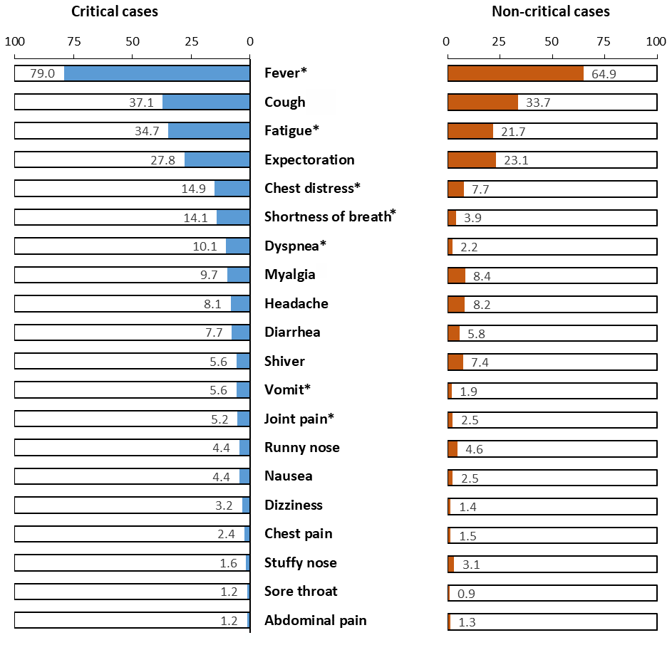 Consistent with previous studies [3, 4, 10, 15], we found that fever and cough were the most common symptoms at the onset of illness. Moreover, we found that critically ill cases had a higher occurrence of fever (79.0% vs 64.9%), fatigue (34.7% vs 21.7%), shortness of breath (14.1% vs 3.9%), chest distress (14.9% vs 7.7%), dyspnea (10.1% vs 2.2%), vomiting (5.6% vs 1.9%) and joint pain (5.2% vs 2.5%) compared with non-critical cases. The different proportion of symptoms at the onset of illness in critical and non-critical cases might be related to the severity of disease, comorbid conditions, and affected organs. A previous study compared the symptoms between 20 survivors and 32 non-survivors in a single-centered, retrospective, observational study, and showed that the proportion of fatigue (or malaise) was higher in non-survivors (44%) than in survivors (20%), although not statistically significant [3]. Another study compared 109 dead patients and 116 recovered patients in Wuhan, and showed that the patients who died had a higher proportion of fever before admission (87.2% vs 81.0%), fatigue (27.5% vs 23.3%), dyspnea (70.6% vs 19.0%), and expectoration (32.1% vs 12.1%), although only dyspnea and expectoration were statistically significant [9]. Guan and colleagues reported that the proportion of shortness of breath was higher in severe cases (37.6%) than in non-severe cases (15.1%) during hospitalization [10]. Further studies are needed to identify the underlying mechanisms of COVID-19 pathogenesis in critically ill cases.