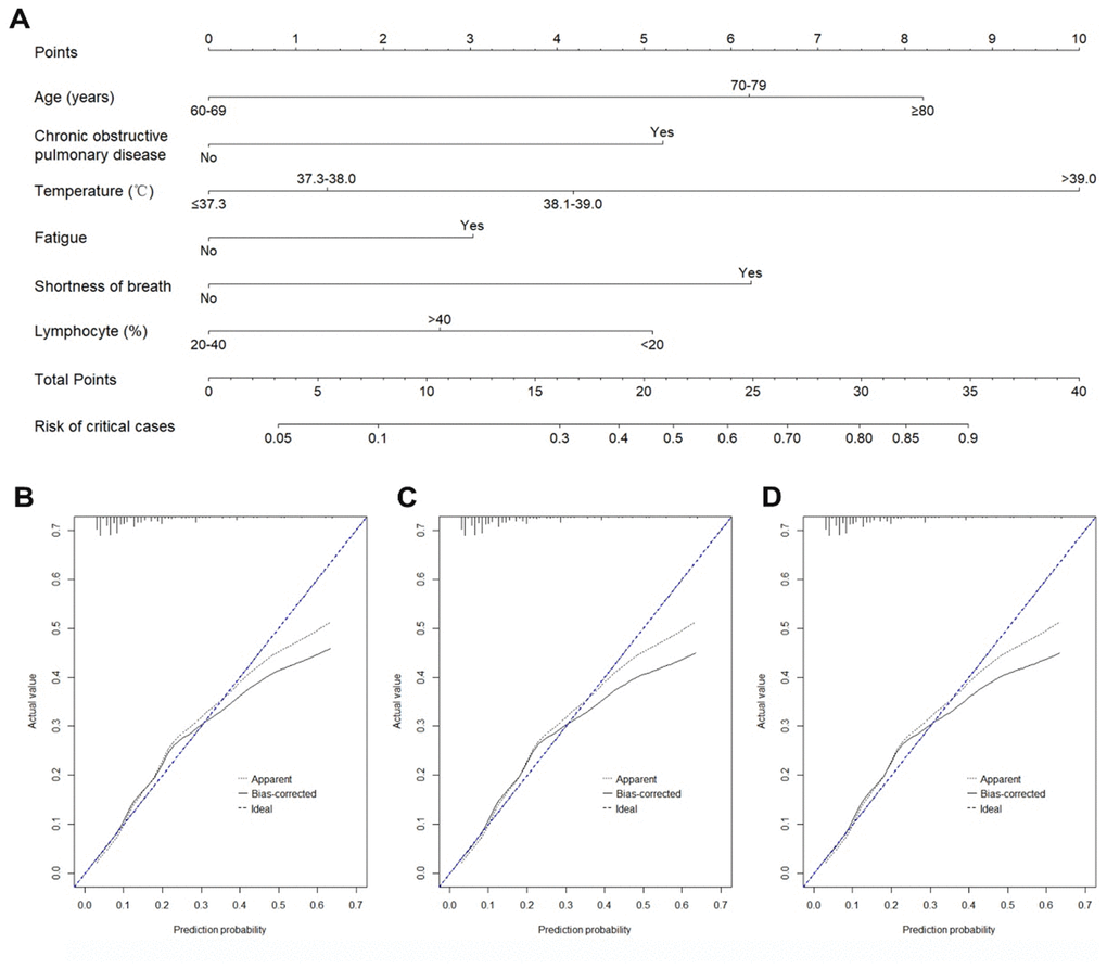 We developed a nomogram for prediction of critically ill cases using a multivariable logistic regression model. In the multivariable model, we analyzed potential risk factors related to critically ill cases, including age group (60-69 years, 70-79 years, or 80 years and above), sex (female or male), occupation (factory worker, farmer, retiree, house worker, business services staff, manager, or others), region (urban or rural), medical history (hypertension, diabetes, coronary heart disease, chronic obstructive pulmonary disease, chronic kidney disease, or chronic liver disease), body temperature (<37.3°C, 37.3-38°C, 38.1-39°C, or >39°C), days from onset to diagnosis (≤3 days, 4-7 days, or >7days), white blood cell count (<4×109/L, 4-10×109/L, or >10×109/L), lymphocyte percentage (20%-40%, <20%, >40%), lymphocyte count (<1×109/L, or ≥1×109/L), neutrophil percentage (50-70%, <50%, or >70%), and symptoms (cough, fatigue, expectoration, chest distress, myalgia, shiver, headache, shortness of breath, dyspnea, diarrhea, runny nose, nausea, joint pain, vomit, stuffy nose, chest pain, dizziness, abdominal pain, or sore throat). We applied a backward procedure for variables selection for the multivariable logistic regression model. Regression coefficients were used to generate a nomogram. To examine robustness of the model, sensitivity analysis was conducted by including age as a continuous variable, instead of categorical variable in the model.
