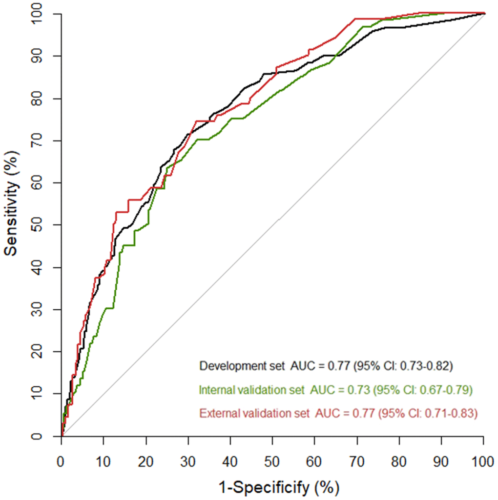 In the external validation cohort, the proportion of critical illness was 9.1%, which was significantly lower than in the development (13.2%) and internal validation (13.5%) sets (p=0.015). Prediction accuracy of the nomogram was stable in the external validation cohort with the AUC of 0.77 (5% CI: 0.71-0.83). The Hosmer-Lemeshow test (p=0.393) and calibration curve (Figure 2D) also showed a good calibration. AUCs of nomogram in the development and validation cohorts were similar (Figure 3).