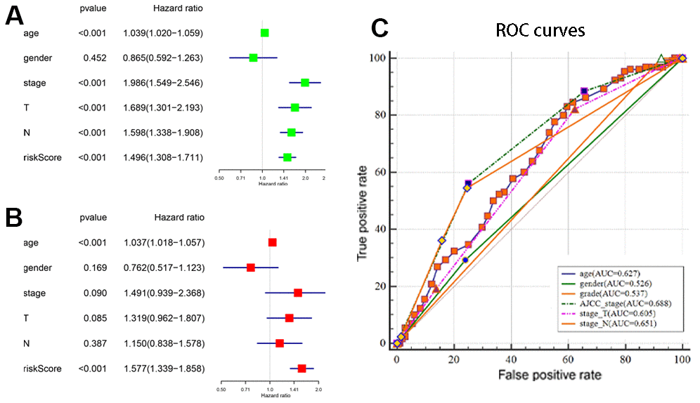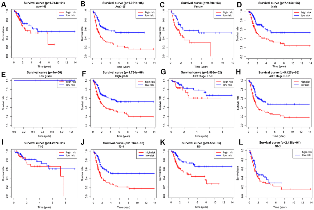 The BCLA patients were classified into high-risk or low-risk groups based on their prognostic risk score by using the median risk score as a cut-off point. The Kaplan–Meier survival curve and two-sided log-rank test was used to compare the overall survival (OS) of the high- and low-risk group patients. Principal component analysis (PCA) was performed to visualize gene expression patterns in the patient samples from the two groups. The receiver-operating characteristic (ROC) curves were applied to evaluate the diagnostic efficacy of each clinicopathological characteristic and the prognostic signature. Stratified survival analysis was performed to examine the accuracy of the prognostic signature in predicting patient survival outcomes. Furthermore, univariate and multivariate Cox regression analyses were performed to evaluate whether the risk score was independent of other clinical variables such as age, gender, grade, AJCC stage, T stage and N stage in determining the prognosis of the BCLA patients. M stage was not analyzed because the data was missing for several patients. P < 0.05 was considered statistically significant.