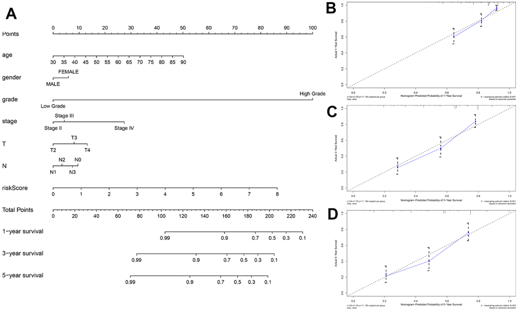 We constructed a nomogram by integrating traditional clinical variables such as age, gender, grade, AJCC stage, T stage and N stage as well as the risk score derived from the prognostic signature to analyze the probable 1-, 3-, and 5-year OS of the BLCA patients. We then used the concordance index (C-index) to evaluate the discrimi-nation and predictive ability of the nomogram. The range of the C-index value was 0.5 to 1.0. A higher C-index indicates greater discrimination ability of the predicting model. Furthermore, calibration curves of the nomogram were generated to examine the concordance between pre-dicted survival and observed survival after bias correction.