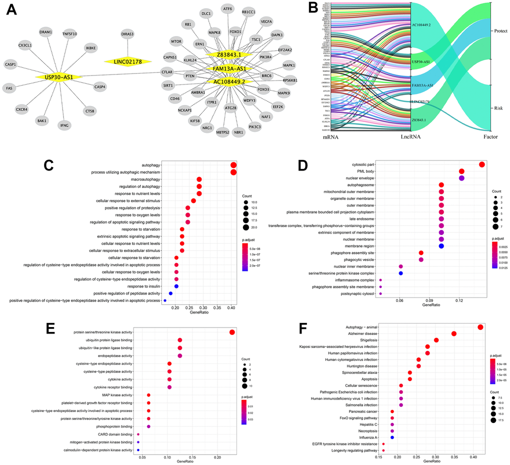 Next, we investigated the potential functions of the 5 autophagy-related lncRNAs in BLCA by constructing the lncRNA-mRNA co-expression network using Cytoscape. The lncRNA-mRNA co-expression network contained 77 lncRNA-mRNA pairs based on the threshold parameters, Pearson correlation coefficient |R| > 0.3 and P < 0.05 (Figure 6A). Among these, 49 mRNAs significantly correlated with the 5 lncRNAs in the prognostic signature. The Sankey diagram showed the relationship between the 49 mRNAs and 5 lncRNAs (risk/protective) (Figure 6B). The top three GO terms for the biological processes were autophagy, process utilizing autophagic mechanism, and macroautophagy (Figure 6C). The top three GO terms for the cellular components were cytosolic part, PML body, and the nuclear envelope (Figure 6D). The top three GO terms for molecular functions were protein serine/threonine kinase activity, ubiquitin protein ligase binding, and ubiquitin−like protein ligase binding (Figure 6E). KEGG pathway analysis confirmed that autophagy was the most significantly enriched pathway (Figure 6F).
