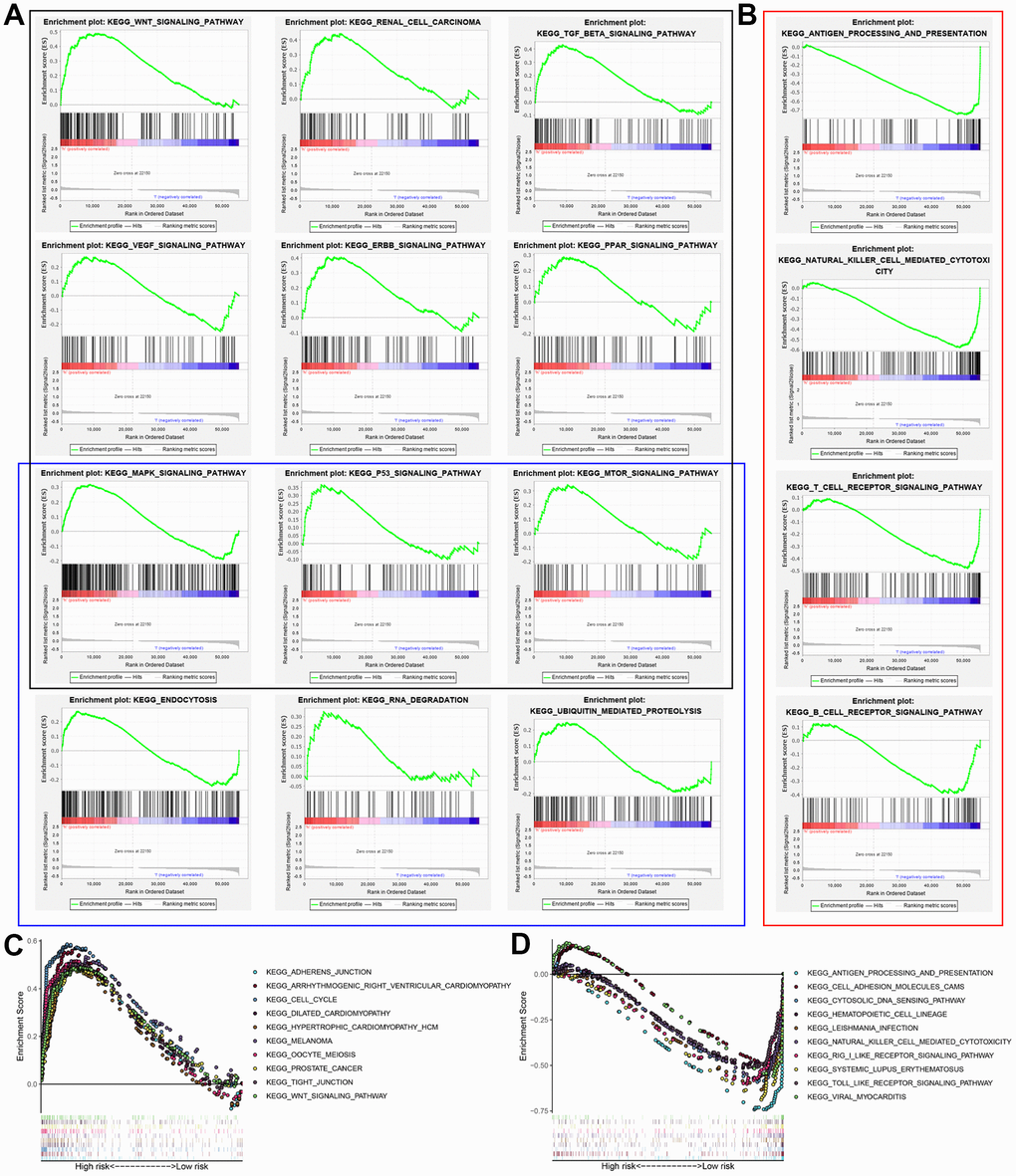 GSEA results showed that the altered genes in the high-risk BCLA patients belonged to pathways related to autophagy and cancer, WNT signaling pathway, renal cell carcinoma, TGF-βsignaling pathway, VEGF signaling pathway, ERBB signaling pathway, PPAR signaling pathway, MAPK signaling pathway, P53 signaling pathway, mTOR signaling pathway, endocytosis, RNA degradation and ubiquitin-mediated proteolysis (Figure 7A). Immunoregulatory pathways against cancer were significantly enriched in the low-risk group, including pathways related to antigen processing and presentation, natural killer (NK) cell-mediated cytotoxicity, T cell receptor (TCR) signaling, chemokine signaling and B cell receptor (BCR) signaling (Figure 7B). This suggested that activation of pathways regulation immune function in the low-risk group may contribute to positive prognosis or longer survival outcomes. The top 10 KEGG pathways in the high-risk and low-risk groups based on GSEA are shown in Figure 7C and 7D. These results suggested that a high prognostic signature risk score correlates with autophagy and cancer, whereas low prognostic signature risk score correlates with enhanced immune function. These data provided valuable insights for future investigations into potential individualized treatments for BLCA patients belonging to different risk groups.