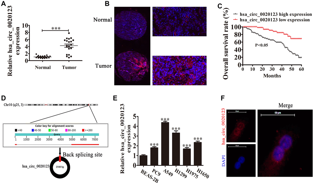 We also found that hsa_circ_0020123 was derived and cyclized from a portion of the PDZD8 gene exon and was located at chr10:119042605-119049859 (Figure 1D). qRT-PCR confirmed that hsa_circ_0020123 expression increased in NSCLC cell lines (H1299, A549, H1975, PC9, and H1650), compared with normal human lung epithelial cells (BEAS-2B) (P<0.001) (Figure 1E). The highest expression was in H1299 and A549 cells, which were used in the subsequent assays. FISH showed that hsa_circ_0020123 was predominantly located in cytoplasm (Figure 1F).