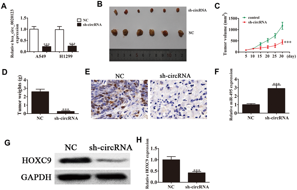 The Ethics Committee in Xinhua Hospital, Shanghai Jiaotong University School of Medicine approved all experiments performed in animals. We purchased 12 BALB/c nude mice, 4 weeks of age, weighing 15~20 g from SLARC, Shanghai. We purchased lung cancer cell lines H1975, H1299, PC9, A549, and H1650, and the normal lung epithelial cell line, BEAS-2B from the American Type Culture Collection (Manassas, VA, USA). We cultured cells in Dulbecco’s Modified Eagle’s Medium (DMEM; Gibco, Gaithersburg, MD, USA) with fetal bovine serum (FBS; Gibco, Gaithersburg, USA), 100 IU/mL of 10%, penicillin, and 100 μg/mL streptomycin at 37°C and 5% CO2. We transfected small interfering RNAs (siRNAs), miR-495 inhibitors, miR-495 mimics, a HOXC9 overexpression vector, and the negative controls into cultured A549 or H1299 cells by Lipofectamine 2000 (Invitrogen, Carlsbad, USA) following the standard kit procedures. To investigate hsa_circ_0020123 activity in vivo, stably transfected hsa_circ_0020123-silenced A549 cells were generated. Hsa_circ_0020123-targeting shRNA, miR-495 mimic, miR-495 inhibitor was synthesized by Sengong Biotech (Shanghai, China), with the following sense sequence: sh-circRNA: forward: 5'-GUCCAAAGAUGGAAAUAAAUU-3', reverse: 5'-AAAUAAAGGUAGAAACCUGUU-3'. miR-495 mimic: 5'-AAACAAACAUGGUGCACUUCUU-3'. miR-495 inhibitor: 5'-AGGCCGCCACCCGCCCGCGAUCCCU-3'. We purchased overexpression plasmid of HOXC9 (pcDNA3.1-HOXC9) and hsa_circ_0020123 (pcDNA3.1-hsa_circ_0020123), and empty plasmid (pcDNA3.1) from GeneChem (Shanghai, China).