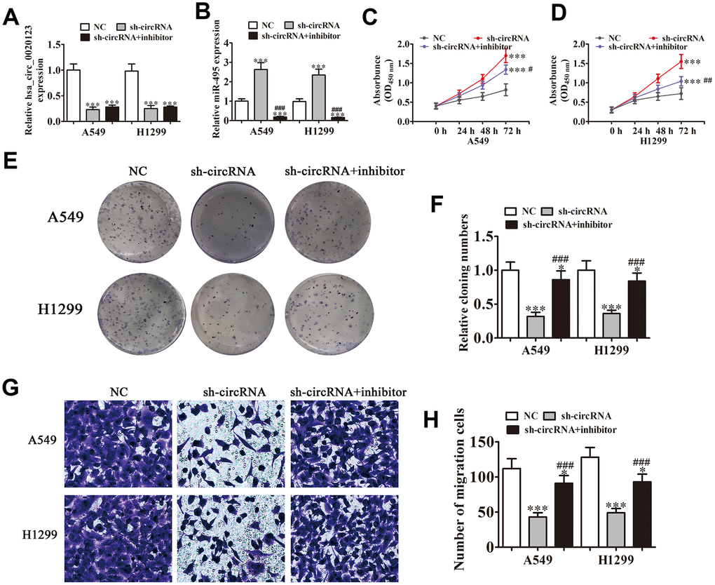 Statistical analysis showed that miR-495 was the downstream target of hsa_circ_0020123. qRT-PCR verified that hsa_circ_0020123 expression was suppressed significantly by lentivirus-mediated silencing. miR-495 suppression had no effects on hsa_circ_0020123 expression (Figure 3A), and hsa_circ_0020123 downregulation significantly promoted miR-495 expression. The miR-495 inhibitor significantly reduced miR-495 expression (Figure 3B). The CCK8 and colony formation assays verified that hsa_circ_0020123 silencing suppressed A549 and H1299 cell proliferation and miR-495 inhibition reversed hsa_circ_0020123 silencing-induced inhibition of proliferation (Figure 3C–3F). The A549 and H1299 cell migration was inhibited by hsa_circ_0020123 silencing but restored by decreased miR-495 expression (Figure 3G, 3H). The overall results showed that hsa_circ_0020123 silencing inhibited NSCLC cell migration and proliferation via miR-495 promotion, but the mechanism remains to be established.