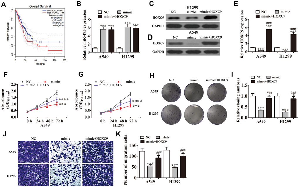 Bioinformatics analyses indicated that high HOXC9 expression correlated to a poor prognosis in NSCLC patients (P<0.001) (Figure 4A). qRT-PCR found that transfection with miR-495 mimics promoted miR-495 expression in both H1299 and A549 cells (P<0.001). HOXC9 overexpression had no effect on miR-495 level after overexpression of miR-495 (P<0.001) (Figure 4B), indicating that HOXC9 was a downstream miR-495 target. Western blot assays verified that miR-495 overexpression inhibited HOXC9 protein expression, but after transfection with HOXC9, overexpression of vector promoted HOXC9 expression even after miR-495 overexpression (Figure 4C–4E). Colony formation assays and CCK8 assays found that HOXC9 overexpression reversed miR-495-induced inhibition of A549 and H1299 cell proliferation (Figure 4F–4I). H1299 and A549 cell Transwell migration was inhibited in cells that overexpressed miR-495 but was restored in cells that overexpressed HOXC9 (Figure 4J, 4K), consistent with miR-495 targeting of HOXC9.