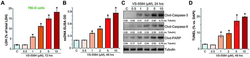 Cell death assay results showed that VS-5584 dose-dependently induced LDH release into the culture medium (Figure 2A), indicating cell death. VS-5584 treatment (1-10 μM) of 786-O cells also increased single strand DNA (ssDNA) production (Figure 2B). Western blotting assay results, Figure 2C, demonstrated that VS-5584 dose-dependently induced cleavages of caspase-3, caspase-9 and PARP (poly ADP-ribose polymerase) in 786-O cells. Additional studies demonstrated that the percentage of TUNEL-positive nuclei was significantly increased with VS-5584 (1-10 μM) treatment (Figure 2D), thereby confirming apoptosis activation. Lower concentrations of VS-5584 (0.5 μM) failed to induce 786-O cell apoptosis (Figure 2A–2D). Collectively, our data suggest that VS-5584 induced apoptosis activation in 786-O RCC cells.
