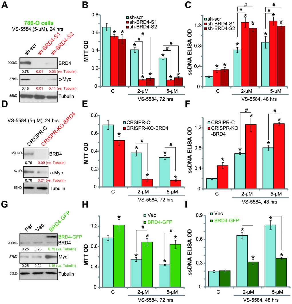 Based on the above results, we predicted that forced BRD4 overexpression shall inhibit VS-5584 activity. To test this hypothesis, a lentiviral BRD4-expression vector was transfected into 786-O cells. After puromycin selection, the stable cells showed exogenous BRD4 expression (tagged with GFP, Figure 5G). c-Myc expression was increased in BRD4-overexpressing cells (Figure 5G). Compared with the vector control cells, BRD4-overexpressing cells showed significant reduction in cell death (Figure 5H) and apoptosis activation (Figure 5I) following VS-5584 treatment. Collectively, these results confirm that BRD4 is the primary factor of VS-5584 resistance in RCC cells.