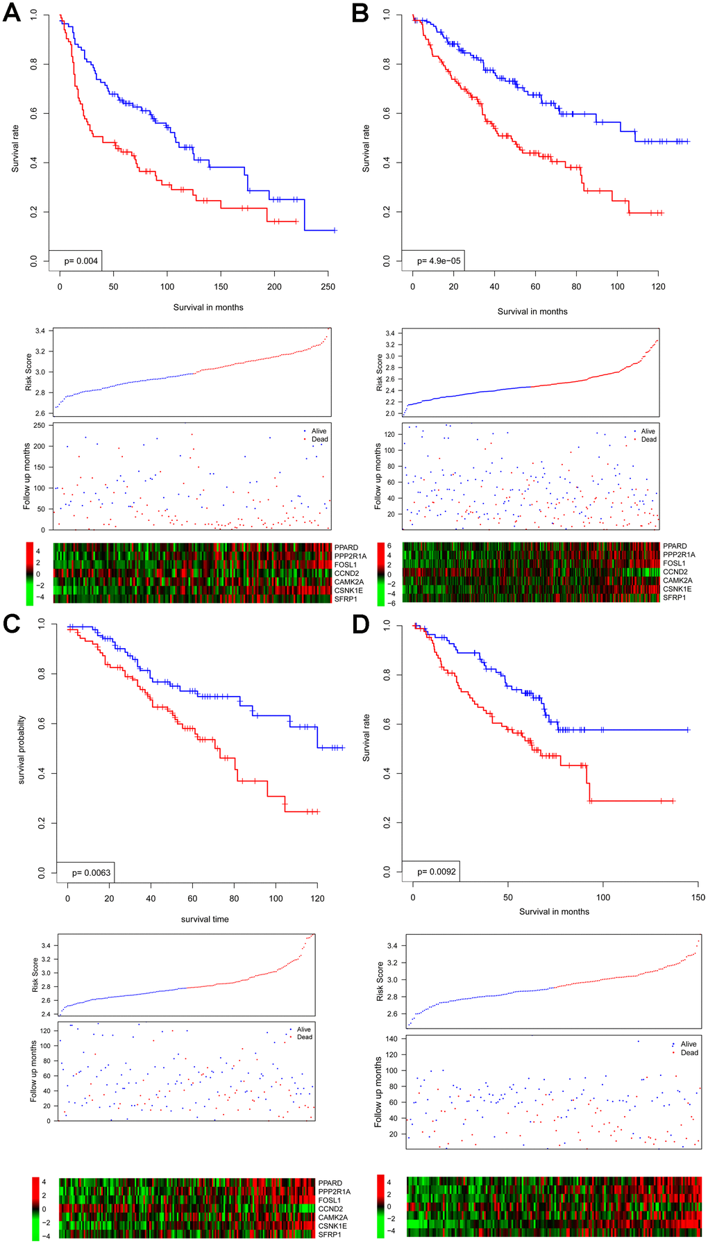In all independent cohorts, survival intervals are significantly lower in the high-risk group (p = 0.004, 4.9e-5, 0.0063, and 0.0092, respectively) (Figure 2A–2D). Consistent with this observation, gene expression and survival patterns of the independent cohorts resemble those of the training cohort.
