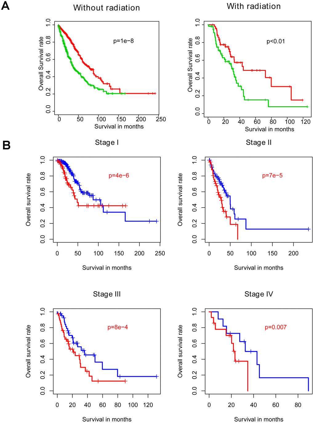 Radiotherapy is one the most important adjuvant therapies offered to NSCLC patients. Thus, samples were divided into radiotherapy-treated and –untreated subgroups for within-subgroup evaluation of risk score performance. Consistent with abovementioned results, both high-risk groups exhibited longer survival intervals in the training cohort, relative to the low-risk groups (Figure 4A). Similarly, analyzing samples subdivided according to stage (Figure 4B) or LUAD versus LUSC subtype (Figure 4C) demonstrated no model bias in predicting prognosis.