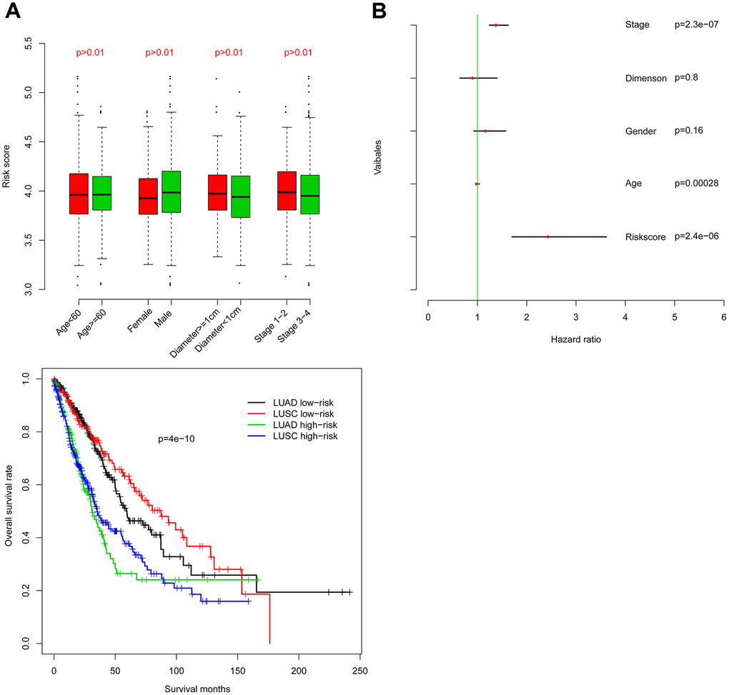 Firstly, risk score was analyzed for correlation with existing clinical indicators (variables), and risk score is not significantly associated with age, tumor size, or pathological stage (Figure 3A). Furthermore, Cox multivariate regression was implemented using risk score as well as clinical indicators (Figure 3B). Results suggest that risk score has value independent from clinical indicators in predicting NSCLC clinical outcome.