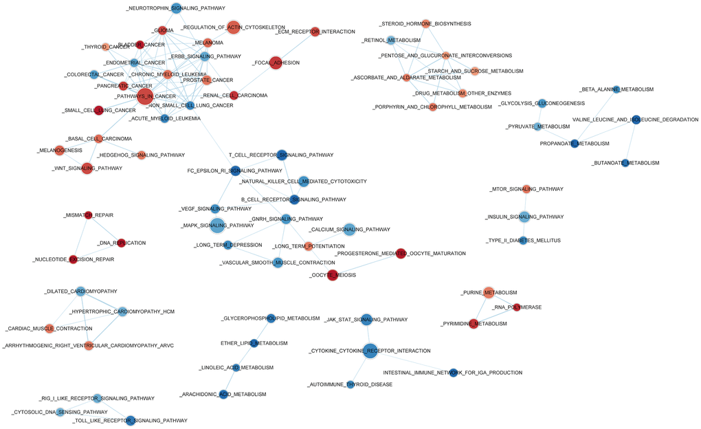 Gene Set Enrichment Analysis (GSEA) was used to investigate high- and low-risk group transcriptomic data biological meaning, and results were visualized using the Cytoscape plugin EnrichmentMap. Enriched biological cassettes include up-regulation of cancer-promoting pathways, and down-regulation of cancer- suppressing pathways (Figure 5). Results indicate that the gene expression-based risk score reflects the biological status of pathways underlying NSCLC.
