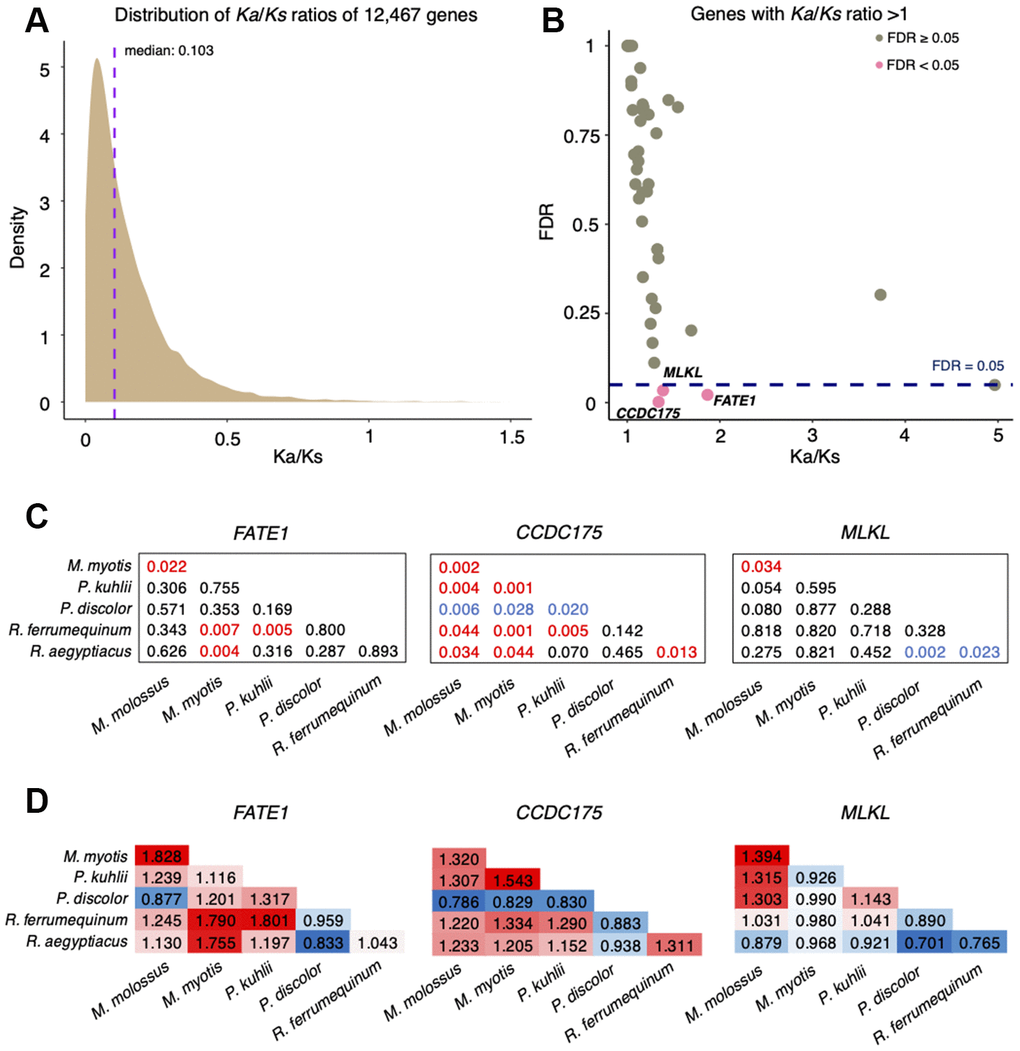 To evaluate the natural selection acting on protein-coding genes between M. myotis and M. molossus, we calculated the ratio of Ka and Ks substitution rates for each pair of orthologous genes. We observed that most of the genes (97.96%) were under purifying selection (Ka/Ks ratio < 1, FDR < 0.05), with the median of Ka/Ks ratios equal to 0.103 (Figure 1A). In total, 48 genes had the ratios of Ka/Ks > 1, only three of which (FATE1, MLKL and CCDC175) exhibited significant positive selection (Fisher’s exact test, FDR < 0.05, Figure 1B). To determine if positive selection on these genes was the consequence of species-specific selective pressures, we conducted pairwise analyses of orthologous genes across 6 bat species (See Methods). We found that each comparison resulted in a unique set of positively selected genes (PSGs) (Supplementary Table 1). Interestingly, positive selection on FATE1 and CCDC175 was also observed between M. molossus, M. myotis and other bat species (Supplementary Table 1). Although MLKL was solely seen under significant positive selection between M. myotis and M. molossus, this gene also showed high Ka/Ks ratios between all possible comparisons of bat species (Figure 1C and 1D).