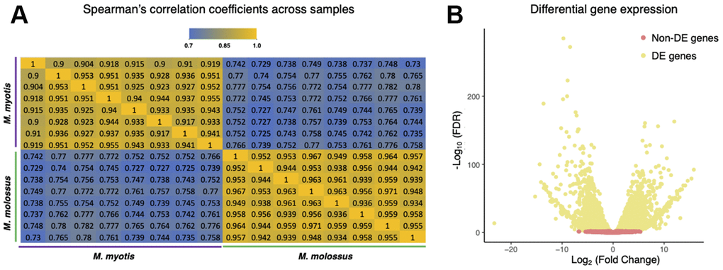 For each sample, raw reads were trimmed adaptors and low-quality regions (< Q25) using Cutadapt (v.1.14) [42]. The filtered reads were subsequently quantified against the reference genes using Salmon (v0.9) [43] with the following parameters: -k 31, -ISF. -k indicates the length of seed while -ISF indicates a library of stranded-specific paired-end reads oriented towards each other. Here, we used 12,467 pairs of single-copy orthologs as references for expression analysis for respective species. The genes which were not expressed in either M. molossus or M. myotis were excluded from downstream analysis. Based on gene expression, we computed pairwise Spearman’s correlation coefficients across samples using the R package cor (v.3.6.0) [44]. Prior to analysis, raw expression counts were normalized using TMM (Trimmed Mean of M-value) method and further log2-transformed. Next, differential gene expression analysis was performed using the R package DESeq2 [45]. The genes with an FDR < 0.01 were considered differentially expressed genes (DEGs). In addition, we also investigated the distributions of the Ka/Ks ratios of differentially and non-differentially expressed genes using a Kolmogorov-Smirnov test. We further performed a χ2 test to ascertain if the PSGs between M. myotis and M. molossus correlated with the DEGs identified (P-value < 0.05 was considered significant).