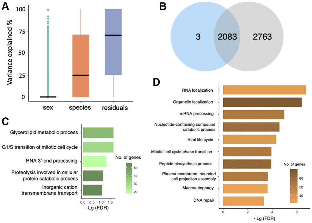 Differential expression analysis measures the difference in mean expression of genes between these two species but fails to uncover the intraspecific gene expression variation [22]. Transcriptomes are subjected to change due to instant alterations of physiological status or environmental context. As the biometrics of M. myotis and M. molossus individuals used in this study, such as age, disease status and environmental circumstances, are unknown, a large proportion of intraspecific transcriptional variation is expected. One purpose of this study is to identify gene expression that genetically differs in these two species; hence we need to explore the genes which have high interspecific but low intraspecific expression variation. To resolve this, we employed a linear mixed model to quantify gene expression variation (See Methods). We focused on 2,086 genes with at least 80% of their overall expression variance resulted from interspecific difference, and indeed, a huge overlap between these genes and DEGs was revealed (Figure 3B). We excluded 2,763 DEGs with large proportions of intraspecific and other unknown variation from further analyses, as their differential expression might not reflect genetic difference between these two species.