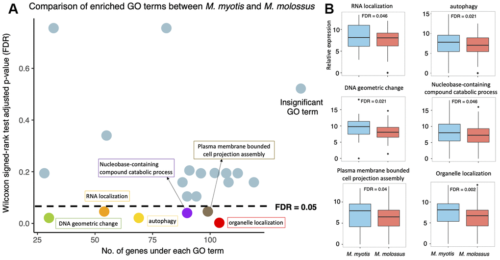To identify the biological processes that were differentially expressed between short-lived and long-lived bats, we investigated the 20 GO terms that were enriched by these 2,086 genes. We compared expression levels of all the genes under each enriched GO term between M. myotis and M. molossus using Wilcoxon signed-rank test (paired mode, one-tailed test) (See Methods). Out of these 20 terms, the genes under 6 terms had significantly higher expression in long-lived bats than in short-lived bats (FDR < 0.05) (Figure 4A). These GO terms include DNA geometric change (GO:0032392), RNA localization (GO:0006403), autophagy (GO:0006914), nucleobase-containing compound catabolic process (GO:0034655), plasma membrane bounded cell projection assembly (GO:0120031), and organelle localization (GO:0051640) (Figure 4B). In contrast, none of these 20 GO terms exhibited significantly higher expression in M. molossus than in M. myotis, respectively (Wilcoxon signed-rank test, paired mode, one-tailed, FDR < 0.05). The genes under each of these 20 enriched GO terms are available in Supplementary Table 2.