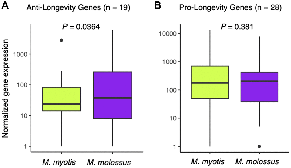 To ascertain whether long-lived bats have naturally evolved a transcriptomic signature of longevity, we compiled a list of anti-longevity and pro-longevity genes and compared their expression in the M. myotis and M. molossus blood transcriptomes. We observed that there was no significant difference in the expression of the pro-longevity genes (n = 28) in long-lived and short-lived bats (P = 0.381, Wilcoxon signed-rank test, paired mode, one-tailed, Figure 5A), while the anti-longevity genes (n=19) had significantly lower expression in long-lived bats (P = 0.0364, Wilcoxon signed-rank test, paired mode, one-tailed, Figure 5B). To assess its significance, we randomly subsampled 19 genes out of 2,086 genes for 1,000 times, and performed Wilcoxon signed-rank tests as stated above and analysed the distribution of the P-values. We noticed that P = 0.0364 fell outside the range of 95% highest density interval (lower: 0.0844, upper: 0.998), suggesting that the significance of the test did not result from random chance.