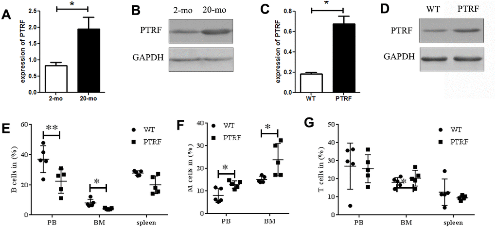 PTRF expression levels increase with age in WI-38 cells and mouse tissues and promote cellular senescence [17, 22]. Consistent with this, PTRF mRNA (Figure 1A) and protein (Figure 1B) levels were significantly higher in the BM cells of 22-month old C57BL/6 mice compared to that of the 2-month old mice. Furthermore, high PTRF levels were also detected in the BM of 2-months old PTRF transgenic mice compared to age-matched WT mice (Figure 1C and 1D). Aged HSCs frequently have a skewed differentiation potential, and produce relatively more myeloid cells compared to lymphoid cells. Compared to the WT mice, the PTRF transgenic mice showed a decreased percentage of B220+ B cells in the PB (22.48 ± 8.07 in PTRF vs. 37.04 ± 8.94 in WT) and BM (4.28 ± 0.45 in PTRF vs. 7.99 ± 2.84 in WT) (Figure 1E). Compared to the WT mice, the PTRF transgenic mice showed an increased percentage of CD11b+ and Gr-1+ M (monocytes and granulocytes) cells (Figure 1F) in the PB(12.88 ± 1.65 in PTRF vs. 8.034 ± 3.06 in WT) and BM(23.86 ± 7.16 in PTRF vs. 15.12 ± 1.44 in WT), although T cells were not affected by the increased PTRF levels (Figure 1G). Taken together, PTRF was upregulated in the BM of aged mice and its ectopic expression increased myeloid differentiation and diminished that to the lymphoid lineage, indicating a crucial role in HSCs aging.
