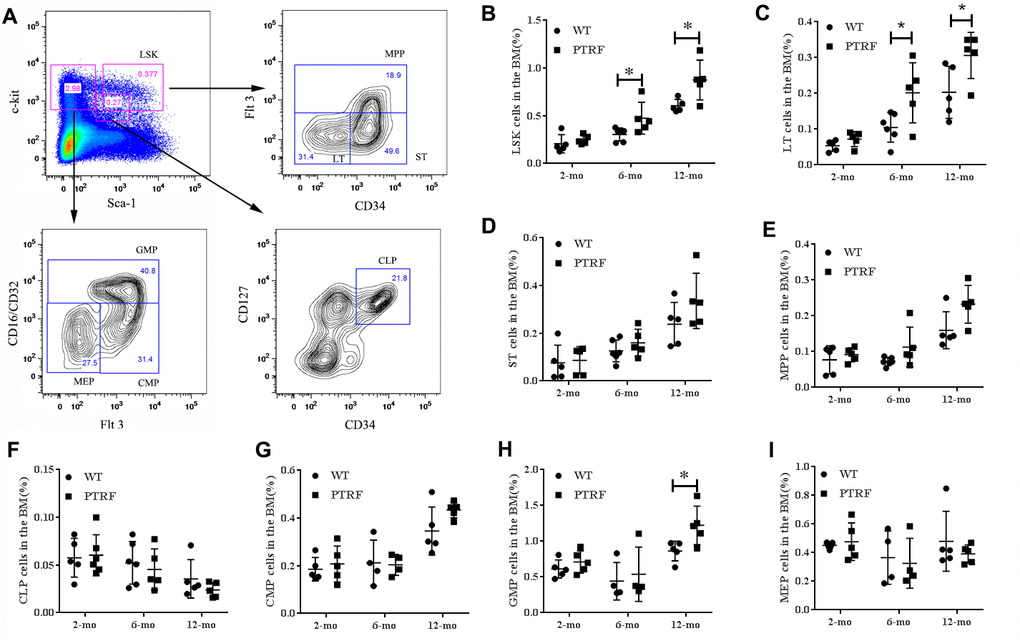 To further investigate the role of PTRF in HSC aging, we analyzed the relative proportion of LSKs (Lin-Sca1+c-kit+), LT-HSCs (Lin-Sca-1+c-Kit+CD34-Flt-3-, long-term HSCs), ST-HSCs (Lin-Sca-1+c-Kit+CD34+ Flt-3-, short-term HSCs) and MPPs (Lin-Sca-1+c-Kit+Flt-3+, multipotent progenitors) in the BM of 2, 6 and 12-month old PTRF and WT mice (Figure 2A). The percentage of LSKs were similar in the young mice, but increased significantly in the 6 and 12-month PTRF mice (1.56-fold, P=0.0460 and 1.47-fold, P=0.0246) compared to the age-matched WT mice (Figure 2B). The frequency of LT-HSCs also showed an age-dependent increase in the PTRF mice (1.92-fold, P=0.0342 and 1.51-fold, P=0.0453 at 6 and 12 months respectively) compared to the WT mice (Figure 2C). In contrast, the frequency of ST-HSCs and MPPs were similar in both groups and did not undergo any significant change during aging (Figure 2D and 2E). HSCs differentiate to the common lymphoid progenitors (c-KitlowSca-1lowLin-, CLPs) and common myeloid progenitors (CD34+CD16/CD32-, CMPs) in the BM [23, 24]. The latter then differentiate to the more lineage specific granulocyte-macrophage progenitors (CD34+CD16/CD32+, GMPs) and megakaryocyte-erythroid progenitors (CD34-CD16/CD32-, MEPs). We observed fewer CLPs (Figure 2F) and an increased proportion of GMPs (Figure 2H) in the PTRF compared to the WT mice, while no significant changes were seen in the percentages of CMPs and MEPs (Figure 2G and 2I). Taken together, PTRF overexpression in the BM correlated with an increased number of aged HSCs, which was most prominent in the LT-HSCs as opposed to the ST-HSCs or MPPs compartments.