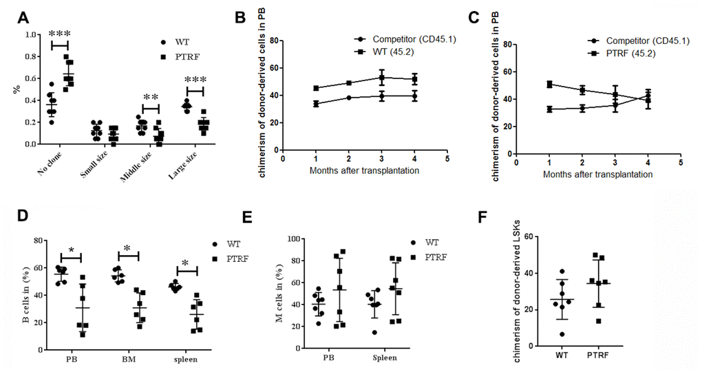 The clonogenic potential of LT-HSCs isolated from PTRF and WT mice (n=8) were next analyzed by the routine methylcellulose colony assay. The PTRF-overexpressing cells generated fewer and smaller colonies compared to WT LT-HSCs (Figure 3A), which suggested a defect in the self-renewal capacity of the LT-HSCs. This is consistent with previous observations that the repopulation and self-renewal abilities of aged murine HSCs are reduced despite an age-related increase in their number. To further analyze the effect of PTRF on the self-renewal and differentiation capacity of HSCs, we transplanted equal numbers of donor PTRF/WT CD45.2+ cells and competitor CD45.1+ cells into lethally irradiated mice (CD45.1/CD45.2). The recipient mice showed lower engraftment of the PTRF-derived cells (Figure 3C) compared to that of the WT-derived cells (Figure 3B) at different time points after transplantation. In addition, the percentage of donor-derived B cells was decreased in the PB (30.97 ± 10.87 in PTRF vs. 52.45 ± 3.04 in WT), BM (30.95 ± 17.41 in PTRF vs. 53.45 ± 5.32 in WT) and spleen (26.12 ± 10.80 in PTRF vs. 46.75 ± 0.92 in WT) (Figure 3D) 16 weeks post-transplantation in the mice receiving PTRF-derived cells. The percentage of donor-derived M cells was increased (Figure 3E) 16 weeks post-transplantation in the mice receiving PTRF-derived cells. Compared to the WT mice, the percentage of LSKs was also higher in the mice transplanted with PTRF-derived cells (Figure 3F). Although the above changes did not reach statistical significance, we can conclude from the results that PTRF-overexpressing HSCs failed to reconstitute hematopoiesis in irradiated recipients and had altered differentiation potential.