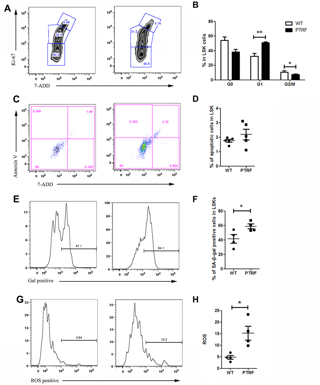 Since most LT-HSCs in adult mice remain quiescent [26], the effect of PTRF on the frequencies of quiescent or cycling LT-HSCs was also analyzed (Figure 4A). The BM of PTRF-overexpressing mice exhibited an increased percentage of LT-HSCs in the G1 phase (50.97 ± 5.39% in PTRF vs. 32.2 ± 7.93% in WT, P=0.0039) with a concomitant decrease in the S–G2/M phase (7.29 ± 1.59% in PTRF vs. 10.62 ± 1.61% in WT, P=0.023). However, PTRF had no effect on the number of quiescent (G0) LT-HSCs (38.42 ± 10.16% in PTRF vs. 54.3 ± 11.45% in WT) (Figure 4B). In addition, there were no significant differences in the frequencies of apoptotic HSCs between the PTRF and WT mice (Figure 4C and 4D). Thus, PTRF overexpression induced cell cycle arrest in the HSCs at the G1 phase rather than affect quiescence and apoptosis. Consistent with this, the LSKs from PTRF mice showed higher levels of the fluorescent β-gal substrate C12FDG (Figure 4E), and an increase in the percentage of cells with SA-β-gal activity compared to the WT cells (58.8 ± 6.57% in PTRF vs. 41.4 ± 11.7% in WT) (Figure 4F), indicating senescence induction. The loss of quiescence frequently correlates with increased levels of reactive oxygen species (ROS) in the LT-HSCs, which in turn impairs their self-renewal [26]. Consistent with the results so far, PTRF-overexpressing LSKs showed higher levels of ROS compared to that from WT mice (15.26 ± 5.98% in PTRF vs. 4.78 ± 1.65% in WT) (Figure 4G and 4H).