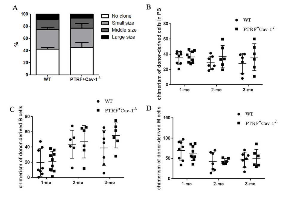 The PTRF transgenic mice [19] were crossed with the Cav-1-/- strain to generate the PTRF+Cav-1-/- mice. The recipient mice were the B6.SJL-PtprcaPep3b/BoyJ (CD45.1) and CD45.1/CD45.2 heterozygous stains. All mice had the C57BL/6J genetic background. The animals were kept in a pathogen-free environment and fed standard diet. All animal experiments were approved by the Animal Care and Use Committees of the Institute of Laboratory Animal Science of Peking Union Medical College.