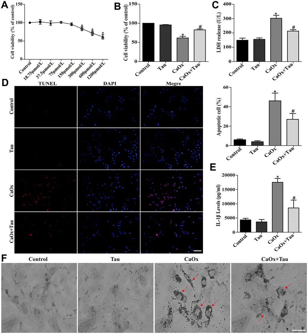 Tau at 0 to 150 μmol/L showed no obvious cytotoxicity on HK-2 cells (Figure 1A). Therefore, a dose of 150 μmol/L was selected for further experiments to avoid the interference of drug toxicity on the experiment. CaOx crystal stimulation significantly decreased cell viability as compared to the control groups. Pretreatment with 150 μmol/L Tau significantly improved cell viability (Figure 1B). The secretion of LDH (Figure 1C) and IL-1β (Figure 1E) induced by CaOx crystals and crystal adhesion (Figure 1F) was significantly decreased by the treatment with Tau. The increased apoptosis following CaOx stimulation was also decreased by Tau pretreatment (Figure 1D).
