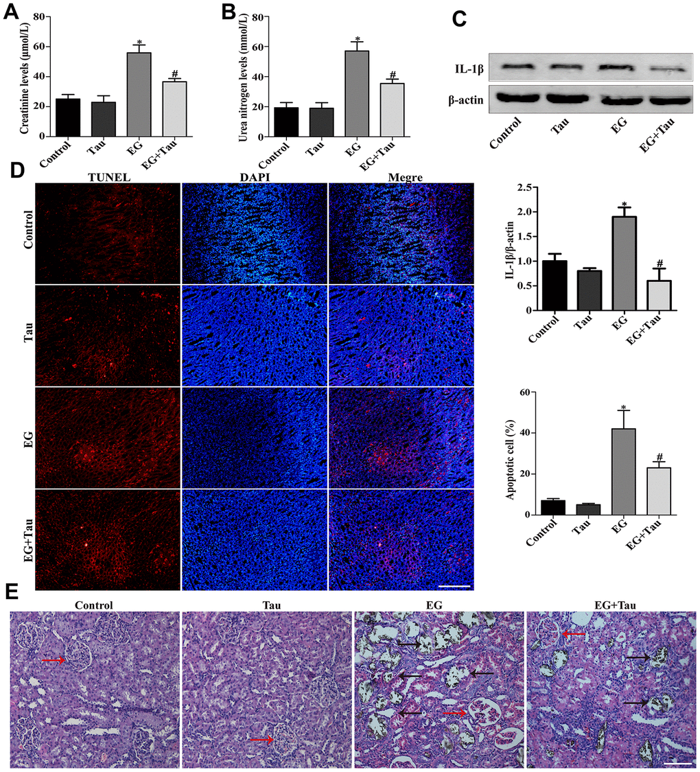 As shown in Figure 2A and Figure 2B, the elevated serum levels of creatinine and urea nitrogen in EG group were attenuated in EG + Tau group. The treatment with Tau also reduced EG-induced renal damage, as evidenced by a significant reduction in IL-1β expression (Figure 2C). Then we examined the crystal deposition in rat renal tubules by Von Kossa staining and found that EG led to crystal retention in rat kidneys. EG group exhibited histopathological alterations and significantly increased crystal deposition in the kidney compared to the controls, indicating the damage to the tubules and glomeruli. Treatment with Tau significantly decreased EG-induced kidney damage and renal crystal deposition (Figure 2E). Moreover, we detected apoptosis in rat kidney tissues using the TUNEL assay kit and found that EG-induced renal crystal deposition is accompanied by an increase in apoptosis, which was significantly reduced by Tau treatment (Figure 2D).