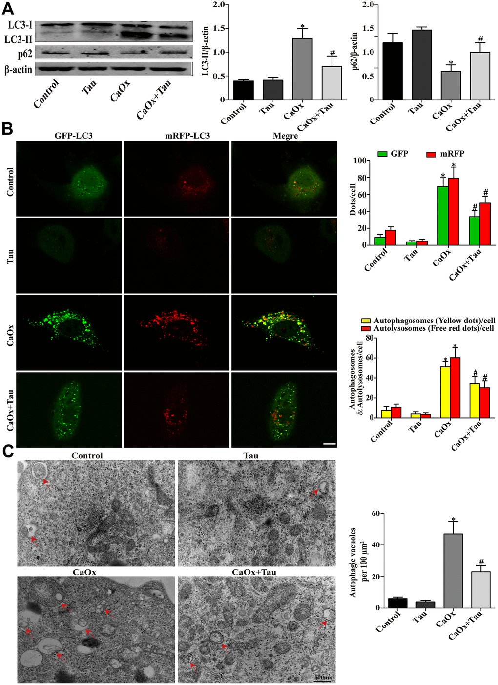 During the process of autophagy, cytosolic LC3 (LC3-I) enzymatically removes a small segment of polypeptide and transforms into autophagosomes (LC3-II). The increase in LC3-II represents the initiation of autophagy. P62 is a protein complex that can be degraded by autophagy. The elevation of LC3-II and the simultaneous decrease in P62 indicate that autophagy is activated. Here, the expression of the key autophagy protein LC3B (LC3-II / LC3-I) in the model group was significantly upregulated compared to the controls. The model group also presented significantly reduced P62 expression and an increased number of autophagic vesicles. Treatment with Tau significantly reduced the excessive activation of autophagy (Figure 3A and Figure 4A) and the formation of autophagic vesicles (Figure 3C and Figure 4C). Immunohistochemistry results were consistent with those of Western blot (Figure 4B). We further transduced HK-2 cells with double-labeled adenovirus to detect autophagic flux. Autolysosomes and autophagosomes were marked as red and yellow dots, respectively, in the merged images. CaOx stimulation significantly increased the green, red, and yellow spots, whereas Tau pretreatment significantly suppressed the formation of autophagic vesicles (Figure 3B).