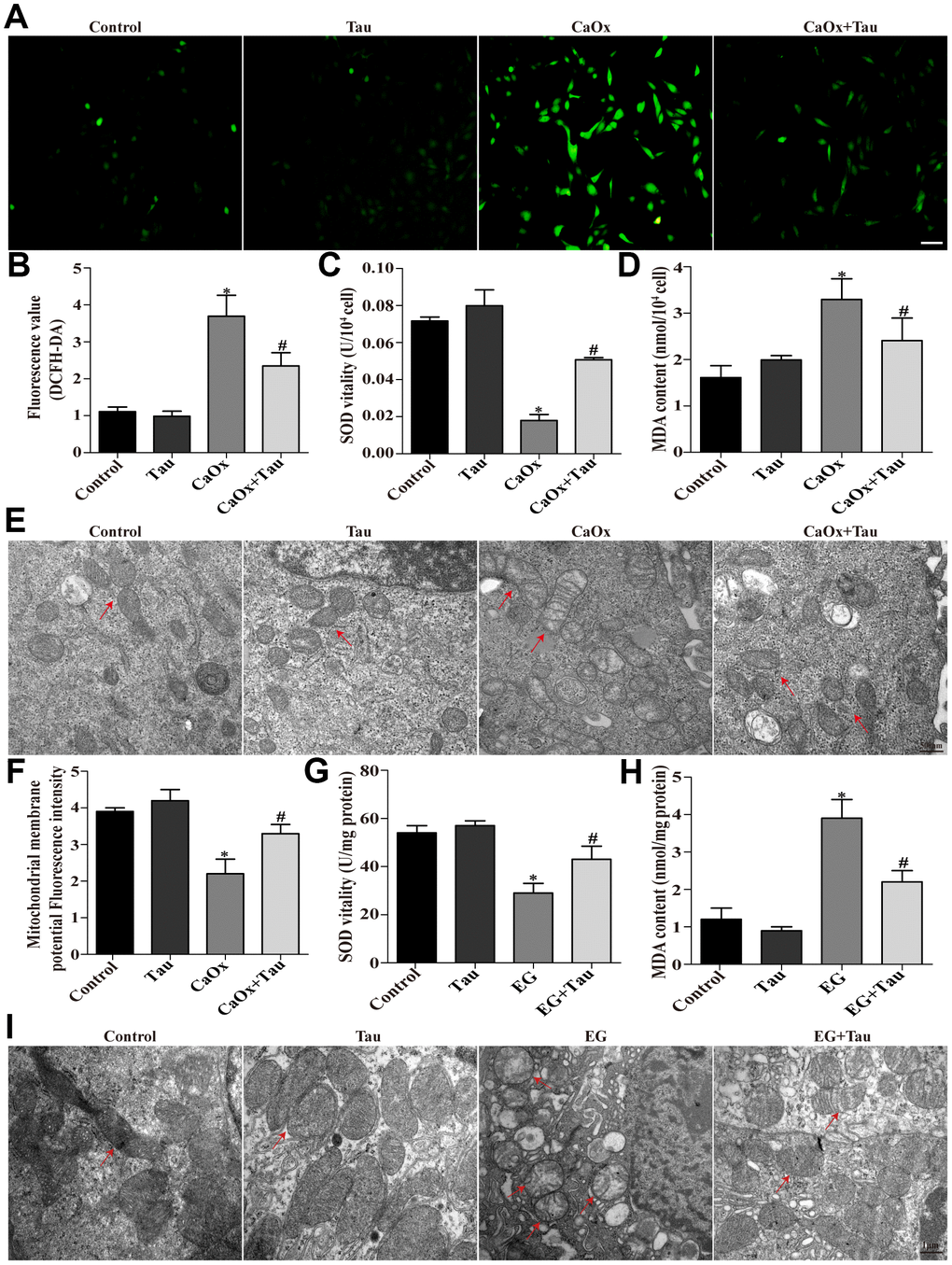 Mitochondrion is one of the most sensitive organelles that can be damaged by excessive oxidation. It has been recognized as the main source of intracellular ROS. We first assessed the damage of HK-2 cells and rat kidneys by using transmission electron microscopy. The mitochondria in Tau group were basically normal compared to the controls, while swelling and deformed mitochondria were found in the model group. Treatment with Tau significantly alleviated mitochondrial damage caused by crystal stimulation (Figure 5E and 5I). Subsequently, we observed that pretreatment with Tau enhanced the mitochondrial membrane potential in cells induced by CaOx crystals (Figure 5F). Furthermore, via examining oxidative stress-related factors, we found that crystal stimulation significantly increased ROS production (Figure 5A and 5B) in HK-2 cells, which was accompanied by a reduction in SOD (Figure 5C) and an upreuglation in MDA (Figure 5D). The results of the animal model were consistent with that in cell culture (Figure 5G and 5H). In contrast, treatment with Tau exerted an opposite effect on CaOx crystals-induced oxidative stress.