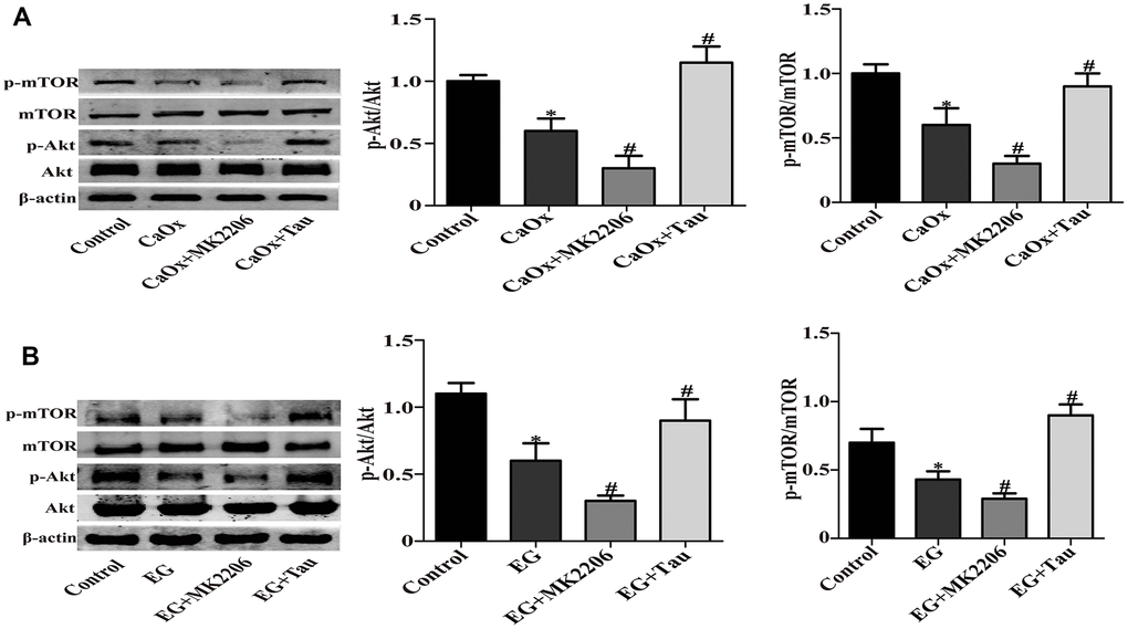Akt/mTOR pathway is a classic pathway in the mediation of autophagy. We hypothesized that Akt/mTOR signaling was involved in Tau-mediated autophagy. The model group showed significantly reduced phosphorylation of Akt and mTOR compared to the controls. Akt inhibitor MK2206 treatment can effectively inhibit the activation of Akt / mTOR signaling pathway, and further reduce the phosphorylation of Akt and mTOR compared to CaOx / EG group. However, Tau treatment effectively reversed the inhibition of Akt/mTOR pathway induced by crystal stimulation (Figure 6A and 6B). These findings indicated the involvement of Akt/mTOR pathway in Tau-mediated autophagy.