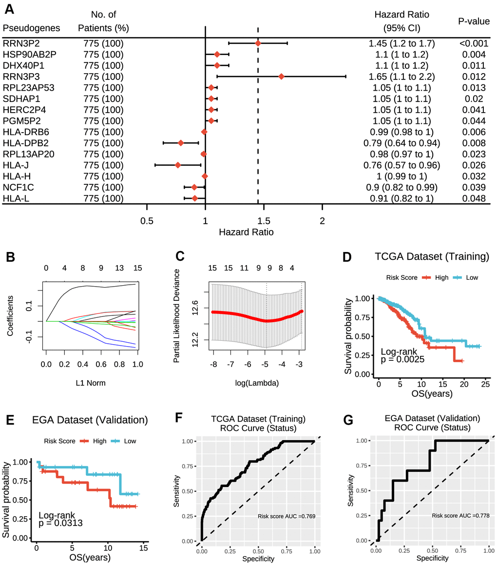 Altogether, a whole list of 13931 pseudogenes were obtained from Vega databases and psiCube databases, of which 308 pseudogenes were available in TCGA datasets and thus included in the subsequent analyses. As results of univariate Cox proportional hazard regression indicated, a total of 15 pseudogenes were ultimately identified to be significantly associated with survival outcomes in TCGA dataset (Figure 1A), which was further verified in EGA dataset (Supplementary Figure 1).