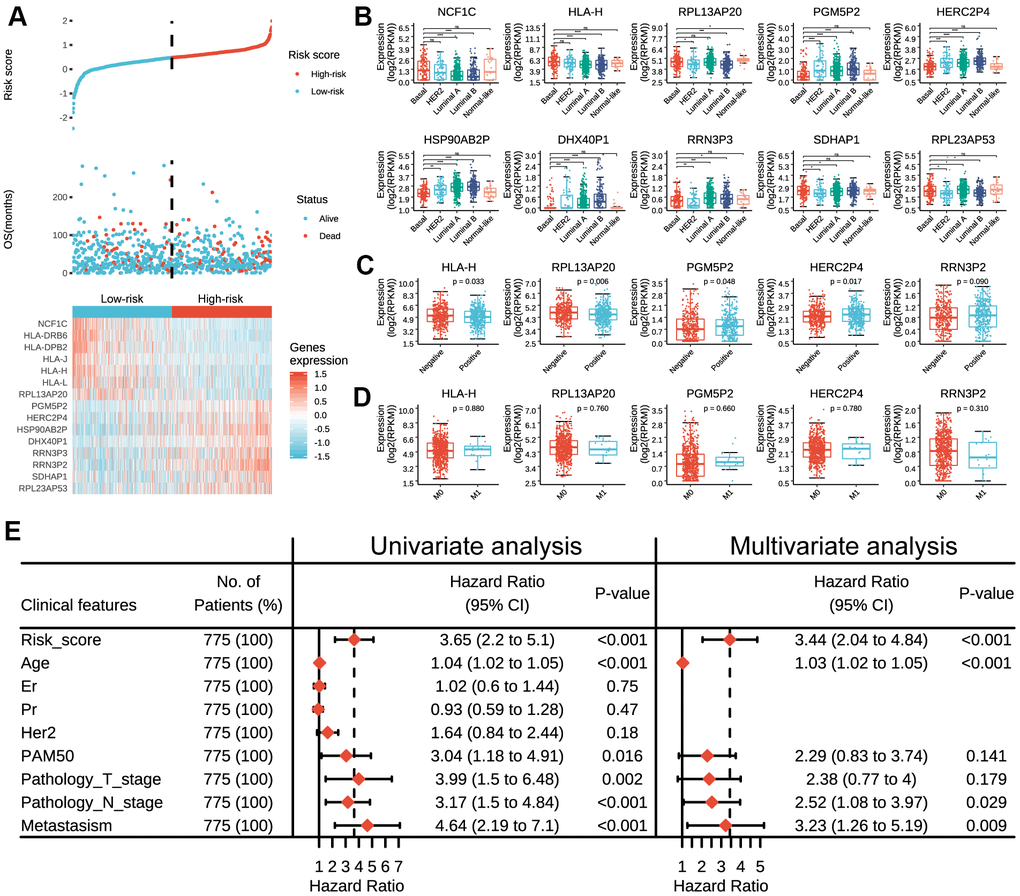 Furthermore, univariate Cox regression analysis demonstrated that risk score, age, PAM50, pathology T stage, pathology N stage and metastasis status were all correlated with the overall survival. When including these factors in the multivariate Cox regression, we found that risk score (p < 0.001), age (p < 0.001), pathology N stage (p = 0.029) and metastasis status (p = 0.009) remained significantly associated with the clinical outcome (Figure 2E), which indicated that the risk score derived from these 15 pseudogenes could independently predict prognosis in breast cancer patients.
